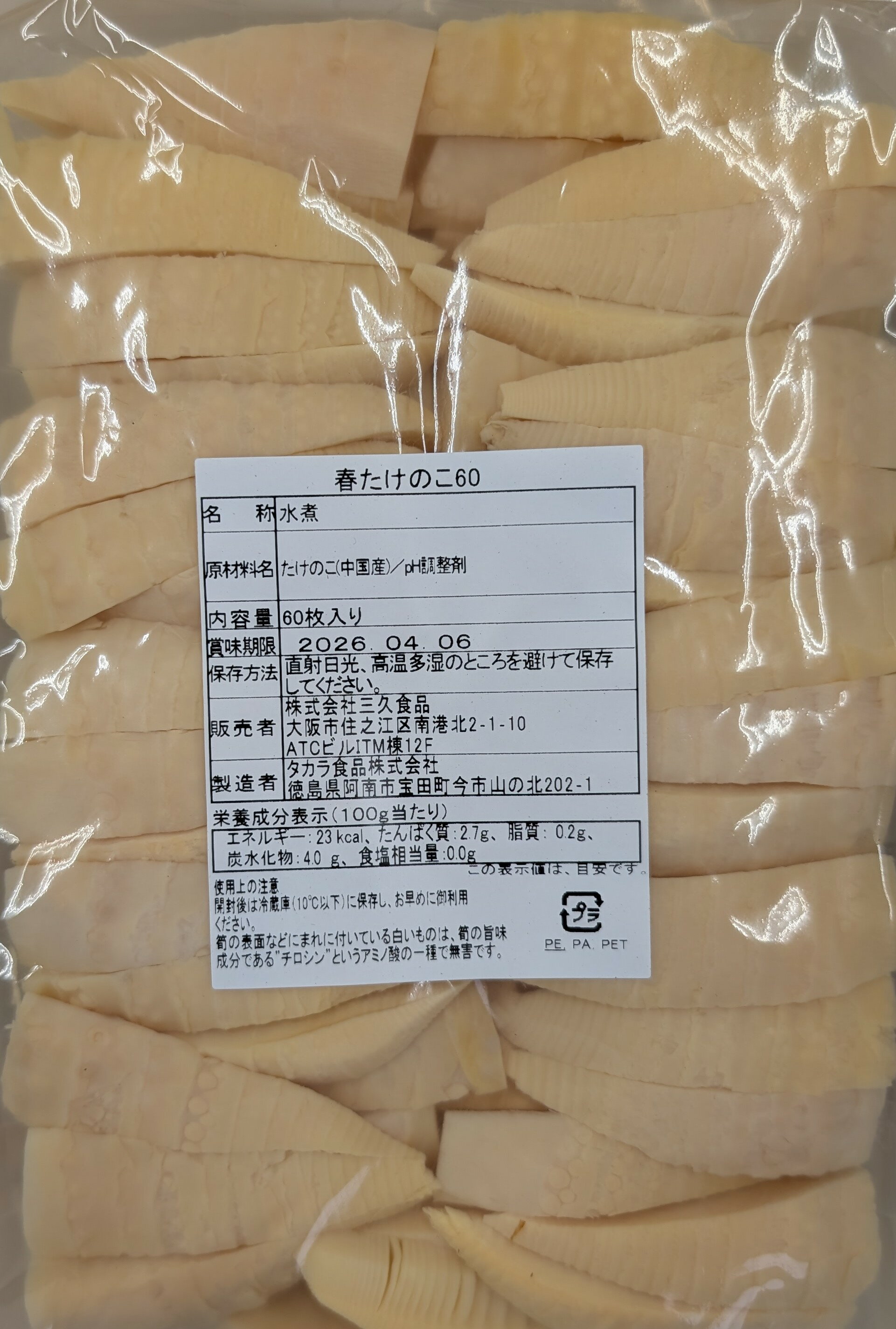 春に収穫されたたけのこを、使いやすい形で水煮加工した業務用商品です。 下処理済みのため、アク抜き不要でそのまま調理にご使用いただけます。 煮物、炊き込みご飯、前菜、和惣菜など幅広い料理に対応。 60枚入りで歩留まりが良く、飲食店・仕出し・惣菜製造向けの商品です。 単価: 1,850円/800g(60個)(P)(税別) 受注最小ロット: 22,200円/800g×12P(P60個)(税別) 加工地: 国内加工(中国産竹の子) 賞味期限: 約半年 ※商品画像は撮影時のものです。 保存方法: 直射日光、高温多湿のところを避けて保存してください 開封後:冷蔵庫(10℃以下)で保存し、お早めにお召し上がりください 原材料、食品添加物: 写真2を参照ください。 ※写真2の賞味期限は気にしないで下さい。 随時新しい商品が入荷しています。 安心して下さい。