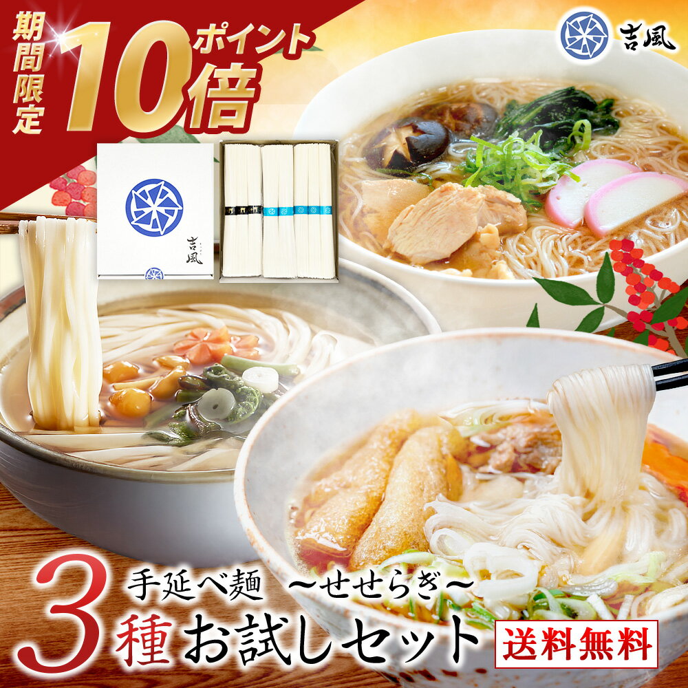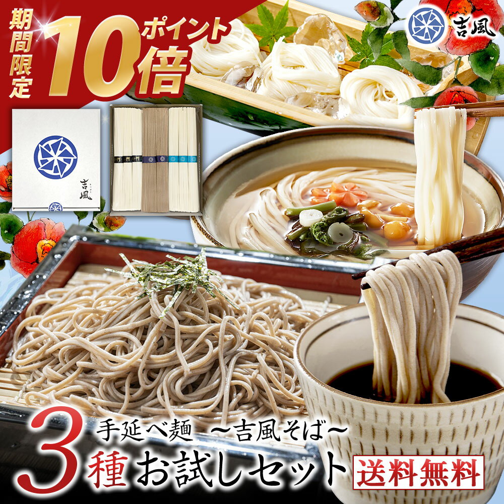 品名 手延べそば手延べそうめん手延べ干しめん 内容量 吉風そば 100g(2束) 三輪そうめん 150g(3束) 吉風うどん ひびき 150g(3束) 原材料名 そば:小麦粉(国内製造)、そば粉、食塩、食用植物油(綿実油)/(そば粉配合割合:20%) そうめん・うどん:小麦粉(国内製造)、食塩、食用植物油(綿実油) 賞味期限 枠外下部に記載 保存方法 直射日光、高温多湿、移り香を避け常温で保存 調理方法(茹で時間) 吉風そば 3分 三輪そうめん:1分 吉風うどん ひびき:5分 製造国 日本 製造者 麺吉村 吉村優子奈良県吉野郡黒滝村長瀬210-1TEL:0747-66-9635 FAX:0747-66-9156 ご注意 ・本製品にはアレルギー物質「小麦・そば」を含みます。 そば:栄養成分表示[100g(2束)当たり] エネルギー 336kcal たんぱく質 12.8g 脂質 2.1g 炭水化物 66.4g 食塩相当量 5.1g 三輪そうめん:栄養成分表示[100g(2束)当たり] エネルギー 352kcal たんぱく質 10.8g 脂質 2.5g 炭水化物 71.9g 食塩相当量 1.7g うどん:栄養成分表示[100g当たり] エネルギー 336kcal たんぱく質 8.8g 脂質 1.6g 炭水化物 71.5g 食塩相当量 6.1g ※推定値 今だけ!ポイント10倍 1000円ポッキリ 送料無料 お試しセット 吉風そば 三輪素麺 うどん 8束 アソート 詰め合わせ 国産 手延べ 蕎麦 奈良県三輪 名産 高級 にゅうめん 夜食 受験生 消化に良い ギフト 家庭用 乾麺 コシ強い のどごし滑らか 長期保存 常温保存対応 製麺所直送 1,000 ~