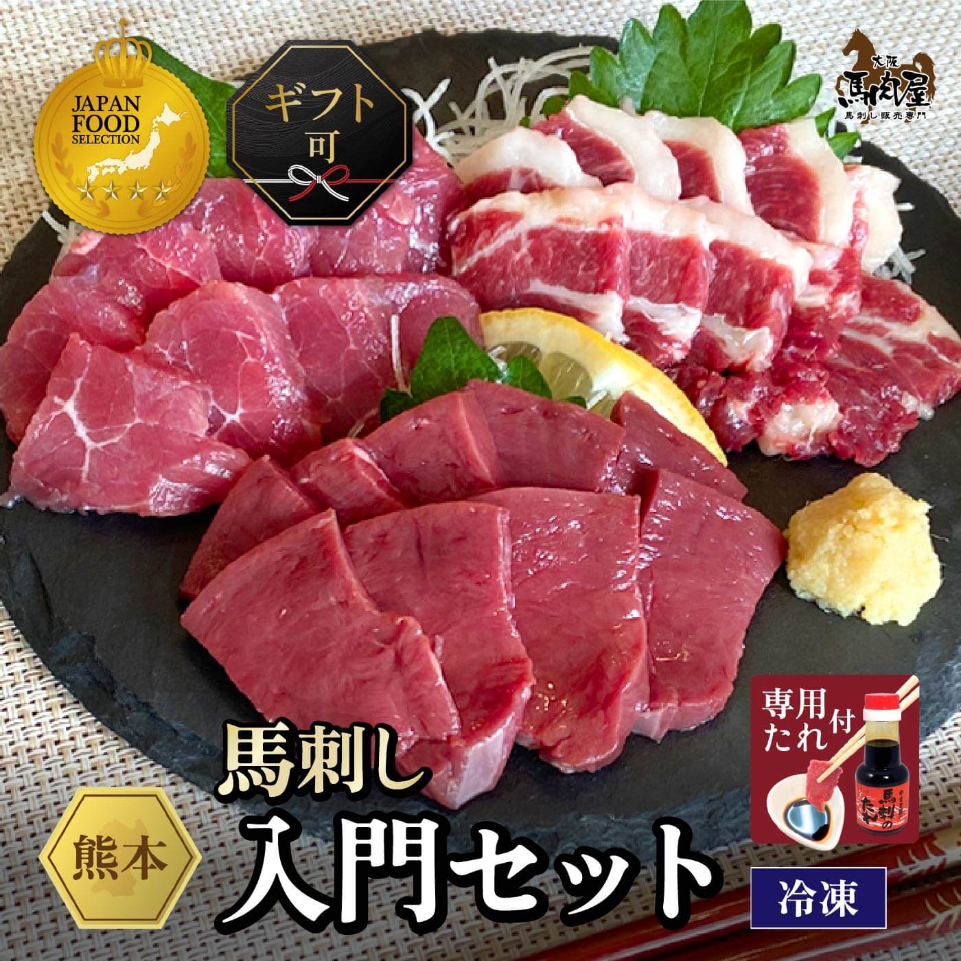 セット名 馬刺し入門セット(2024年7月 ジャパンフードセレクション 金賞受賞) 名称内容量 ・馬刺し 上赤身(約50g)1パック・馬刺し 上カルビ(約50g)1パック・馬刺し ハツ(心臓)(約50g)1パック・馬刺しのタレ(150ml)1本※「たれ無」をご購入の場合は付属しません。 ※「通常梱包」と「ギフトボックス」ご購入の場合は付属します。 オススメの食べ方 馬刺し 赤身と上カルビは専用のタレで、ハツ(心臓)はごま油とお塩がオススメです。 部位説明 【馬刺し 上赤身(50g)】 綺麗な赤い色が特徴の、あっさりとした赤身です。 厳選された上質なモモ肉のみを使用しており、大阪馬肉屋 自慢のNo.1人気商品!馬刺し初心者にオススメ! 【馬刺し 上カルビ(50g)】 アバラ骨の間にある部位で、噛めば噛むほど、ジュワ?っとお口に旨味が広がります。 生で食べても、焼いてもおいしい部位です。 【馬刺し ハツ(50g)】 心臓の部位。 内臓特有の臭みがほとんどなく、かなりさっぱり・あっさり食べることができます。 ゴマ油やお塩をかけて、お酒のアテにオススメ! 【馬刺しのタレ(150ml)】 大阪馬肉屋オススメの馬刺し専用のタレは、バランスが良く醤油のカドがないまろやかな味わいで、馬肉のうま味を倍増させ、口の中でうま味の余韻を長く楽しめます。 ◆原材料:醤油、砂糖、ブドウ糖、カラメル、発酵みりん、アミノ酸 産地 「カナダ・フランス産、国内肥育」もしくは「国産」(いずれも最終肥育地・と畜・加工は熊本県) 加工業者 【熊本県】株式会社 イージャパン(熊本県宇城市豊野町糸石12) 賞味期限 最長5ヶ月 (別途商品ラベルに記載) 配送方法 冷凍便大阪馬肉屋は、土日祝も発送対応しています! 保存方法 ?18℃以下の冷凍保存 解凍・スライス方法 ■馬刺し(冷凍ブロック) 1. 氷水を張ったボウルに真空パックのままいれ、半解凍になるまで浸けます。 (50gの部位で約30分 ※冬場はプラス5分) 2. 真空パックを開け、肉の繊維を断ち切るよう(垂直)にスライスします。 (目安:赤身2?3mm、霜降り3?4mm) 3. 馬刺し専用タレとお好みの薬味でお召し上がりください。 (※)電子レンジ・冷蔵庫・室内や屋外での自然解凍は、大幅な食感や味の悪化、食品安全衛生面でのリスクも高まりますのでおやめください。 送料 送料無料※北海道は別途1,000円、沖縄は別途1,100円かかります。 また、離島・一部地域は追加の送料がかかる場合があります。 原材料名 馬肉 【関連キーワード】 馬刺し は、 贈り物 にも喜ばれます。 父の日 のプレゼントや 晩酌 のおともに、お酒好きの方への ギフト にもおすすめです。 ・ 馬刺し は、 ビール 、 ハイボール 、 ワイン 、 焼酎 、 日本酒 、 熱燗 などの お酒のつまみ に最高です。 ・楽天の キャンペーン 、 楽天スーパーSALE 、 5と0のつく日 、 お買い物マラソン 、 ポイント消化 +楽天 にもおすすめです。 ・簡単調理で、冷凍で長期保存が可能なため、常にストックしておいて、急な来客のもてなしとしておすすめです。 ・熊本の ソウルフード の 馬刺し は 送料無料 でご用意しております。 馬刺し 霜降り 赤身 上赤身 熊本 1kg 国産 レバー ふるさと納税 馬刺しふるさと納税 【検索キーワード】(商品説明ではありません) 馬刺し 通信 関西No.1 の馬刺し 専門店!絶品 馬刺し 流水解凍 簡単調理 切るだけ お手軽に 九州 熊本 の 特産品 の 馬刺し がご自宅で楽しめます。 ちょっとした おもてなし にも。 お取り寄せ グルメ は 冷凍 なので ストック にもおすすめ。 馬刺し専門店 大阪馬肉屋 の 馬刺しは 店舗の 飲食店 にも販売しており 業務用 でも大人気です。 人気の 赤身 は 霜降り 大トロ 中トロ たてがみ コーネ カルビ 生レバー タン ふたえご フタエゴ ヒレ ユッケ 希少部位 ハツ など様々な 部位 をご用意しております。 美味しい お酒 の おつまみ に。 焼酎 日本酒 ウイスキー ビール などの お酒 とも相性抜群!夜ご飯 の一品にも。 真空パック しておりますので食べたいときに 食べたい分だけ 食べられます。 テレビ で人気の 牛とろフレーク ならぬ 馬とろフレーク も 人気 の 商品 です。 【こんな用途に】 父の日 父の日ギフト 父の日プレゼント 母の日 母の日ギフト 母の日プレゼント 御中元 お中元 残暑御見舞 残暑見舞い 敬老の日 ハロウィン 寒中お見舞 クリスマス クリスマスプレゼント お歳暮 年越し 年末 帰省土産 お返し お歳暮ギフト 御正月 お正月 新年 新春 御年賀 お年賀 年末年始 年末グルメ 年末ギフト 御歳暮 歳暮 福袋 バレンタイン ホワイトデー 甘くない お花見 花見 プレゼント アスリート モデル ダイエット 筋力アップ おうち居酒屋 お取り寄せグルメ おつまみ ごちそう 宴会 サプライズギフト お取り寄せ グルメ 熨斗 のし 健康志向 健康 美肌 馬ミンチ 犬用 お歳暮 早割 ギフト 父の日 、 母の日 、 お中元 、 お歳暮 、 お誕生日プレゼント 、 バレンタイン 、 ホワイトデー 、サプライズギフト 、 お返し 、 お祝い 、 内祝い など簡易的な プチギフト としてもご利用いただけます。 ・馬刺し は ヘルシー な