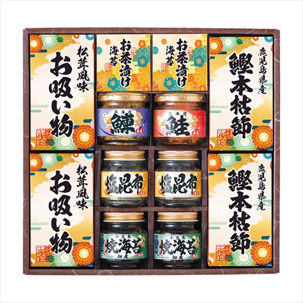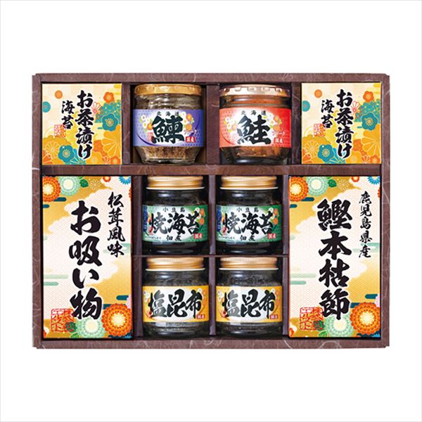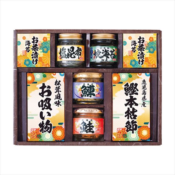 ●紙袋のご用意はできません。 ●ギフト商品のため納品書は同梱されません。 ●メーカー都合により、デザイン・内容等が変更になる場合がございます。 ●ご注文者様宛以外へ発送の場合、お届け先様の転居・住所不明・長期不在などが発生した際は商品をご依頼主様へ転送させていただきます。 明治35年より伝えられてきた「直火釜炊き製法」は、調味料を佃煮に全て染み込ますことにより、ふっくらと炊き上げ、しっかりとした味になっております。 昔ながらの佃煮をご提供いたします。 ■ごま昆布45g・しその実わかめ45g・汐吹昆布20g・山椒昆布45g・ひじき椎茸45g・椎茸入甘煮わかめ45g・鰹入わかめ昆布50g・わかめ木耳50g×各1■箱サイズ:21.5×28×2.8cm【用途】引出物 結婚内祝 婚家 結婚祝 出産内祝 出産祝 仏事 快気 新築 記念 贈答 お返し お祝い 御祝 香典返し 法事 法要 引越し 新築祝い お中元 お歳暮 敬老の日 還暦 賀寿 母の日 父の日 自分へのご褒美 自分へのお取り寄せグルメなど 快気祝い 成人お祝い 金婚式 銀婚式 入籍記念日 白寿 卒寿 米寿 傘寿 喜寿 古希 還暦祝い 賀寿 長寿祝い 緑寿 入園祝い 入学祝い 卒業祝い 就職祝い 新築祝い 開店祝い お土産 お誕生日プレゼント お年賀 お中元ギフト 会社 企業 残暑見舞い●紙袋のご用意はできません。 ●ギフト商品のため納品書は同梱されません。 ●メーカー都合により、デザイン・内容等が変更になる場合がございます。 ●ご注文者様宛以外へ発送の場合 お届け先様の転居・住所不明・長期不在などが発生した際は 商品をご依頼主様へ転送させていただきます。