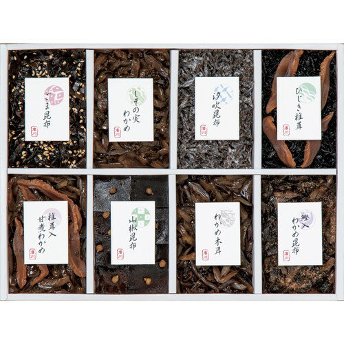 ●紙袋のご用意はできません。 ●ギフト商品のため納品書は同梱されません。 ●メーカー都合により、デザイン・内容等が変更になる場合がございます。 ●ご注文者様宛以外へ発送の場合、お届け先様の転居・住所不明・長期不在などが発生した際は商品をご依頼主様へ転送させていただきます。 明治35年より伝えられてきた調味料を佃煮に全て染み込ますことによりふっくらとしっかりした味に炊き上げる事ができる「直火釜炊き製法」にて製造した佃煮の詰合せ商品です。 ■ごま昆布45g・しその実わかめ45g・汐吹昆布20g・山椒昆布45g・ひじき椎茸45g・椎茸入甘煮わかめ45g・鰹入わかめ昆布50g・わかめ木耳50g 【小麦】■箱215×280×28mm【用途】引出物 結婚内祝 婚家 結婚祝 出産内祝 出産祝 仏事 快気 新築 記念 贈答 お返し お祝い 御祝 香典返し 法事 法要 引越し 新築祝い お中元 お歳暮 敬老の日 還暦 賀寿 母の日 父の日 自分へのご褒美 自分へのお取り寄せグルメなど 快気祝い 成人お祝い 金婚式 銀婚式 入籍記念日 白寿 卒寿 米寿 傘寿 喜寿 古希 還暦祝い 賀寿 長寿祝い 緑寿 入園祝い 入学祝い 卒業祝い 就職祝い 新築祝い 開店祝い お土産 お誕生日プレゼント お年賀 お中元ギフト 会社 企業 残暑見舞い●紙袋のご用意はできません。 ●ギフト商品のため納品書は同梱されません。 ●メーカー都合により、デザイン・内容等が変更になる場合がございます。 ●ご注文者様宛以外へ発送の場合 お届け先様の転居・住所不明・長期不在などが発生した際は 商品をご依頼主様へ転送させていただきます。