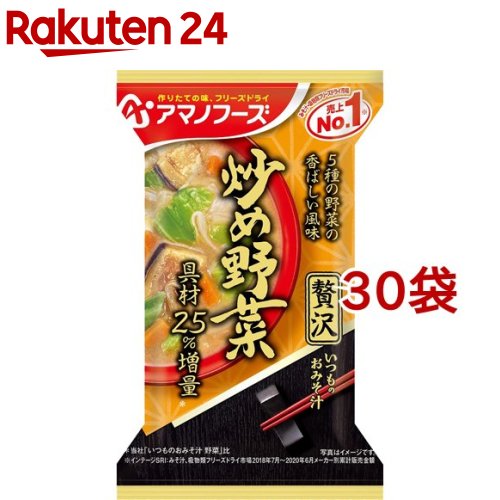 お店TOP>アマノフーズ いつものおみそ汁贅沢 炒め野菜 (1食入*30袋セット)【アマノフーズ いつものおみそ汁贅沢 炒め野菜の商品詳細】●5種類の炒め野菜は、食感を残しながら野菜の甘味を楽しめるように調理。 ●ごま油の香ばしさもきいています。 【召し上がり方】中身をお椀に入れ、熱湯を約160ml注いで軽くかき混ぜてください。 【品名・名称】即席みそ汁(乾燥タイプ)【アマノフーズ いつものおみそ汁贅沢 炒め野菜の原材料】キャベツ(国産)、米みそ、調合みそ、揚げなす、もやし、オニオンソテー、風味調味料、にんじん、みりん、でん粉・デキストリン混合物、ごま油、豚脂加工品、でん粉、香辛料、オニオンパウダー、香味油、酵母エキスパウダー/調味料(アミノ酸等)、酸化防止剤(ビタミンE、ビタミンC)、酸味料、香料、(一部に小麦・乳成分・ごま・さば・大豆・鶏肉・豚肉・魚醤(魚介類)を含む)【栄養成分】1食当たりエネルギー:42kcal、たんぱく質:2.1g、脂質:1.5g、炭水化物:5.1g、食塩相当量:1.9g【アレルギー物質】乳成分、小麦、ごま、さば、大豆、鶏肉、豚肉【保存方法】高温多湿の所を避け、常温で保存してください。 【原産国】日本【ブランド】アマノフーズ【発売元、製造元、輸入元又は販売元】アサヒグループ食品※説明文は単品の内容です。 商品に関するお電話でのお問合せは、下記までお願いいたします。 菓子、食品、健康食品、サプリメント、スキンケアなど:0120-630611ミルク、ベビーフード、乳幼児用品専用:0120-889283リニューアルに伴い、パッケージ・内容等予告なく変更する場合がございます。 予めご了承ください。 ・単品JAN:4971334209703アサヒグループ食品130-8602 東京都墨田区吾妻橋1-23-1 アサヒグループ本社ビル ※お問合せ番号は商品詳細参照広告文責:楽天グループ株式会社電話:050-5306-1825[スープ/ブランド:アマノフーズ/] アマノフーズ いつものおみそ汁贅沢 炒め野菜(1食入*30袋セット)【アマノフーズ】[みそ汁 フリーズドライ 野菜 インスタント みそ] 4,783 ~