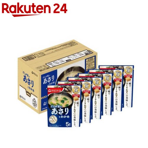 お店TOP>フード>加工食品・惣菜>フリーズドライ食品>フリーズドライ(味噌汁)>うちのおみそ汁 あさりとわかめ (6袋×2セット(1袋5食入))【うちのおみそ汁 あさりとわかめの商品詳細】●フリーズドライブロックだから、一瞬で「つくりたて」の美味しさ。 具材、みそ、だしが一体となり、つくりたての美味しさがギュッと閉じ込められています。 ●家族みんなで食べるのにちょうどいい、5食入タイプのおみそ汁です。 ●あさり出汁の旨みがしっかりと効いたあさりとわかめのおみそ汁です。 【品名・名称】即席みそ汁(乾燥タイプ)【うちのおみそ汁 あさりとわかめの原材料】米みそ(国内製造)、ボイルあさり、ねぎ、あさりエキス調味料、食塩、でん粉、あさりエキスパウダー、乾燥わかめ、こんぶエキスパウダー、香辛料/調味料(アミノ酸等)、酸化防止剤(ビタミンE、ビタミンC)、(一部に大豆を含む)【栄養成分】1食分(6.2g)当たりエネルギー:20kcal、たんぱく質:1.3g、脂質:0.39g、炭水化物:2.8g、食塩相当量:1.4g【アレルギー物質】大豆【保存方法】高温多湿の所を避け、常温で保存してください【注意事項】・本品製造工場ではえび・かに・小麦・卵・乳成分を含む製品を生産しています。 ・本製品で使用しているあさりにはかにが共生しています。 【原産国】日本【ブランド】アマノフーズ【発売元、製造元、輸入元又は販売元】アサヒグループ食品※説明文は単品の内容です。 商品に関するお電話でのお問合せは、下記までお願いいたします。 菓子、食品、健康食品、サプリメント、スキンケアなど:0120-630611ミルク、ベビーフード、乳幼児用品専用:0120-889283リニューアルに伴い、パッケージ・内容等予告なく変更する場合がございます。 予めご了承ください。 ・単品JAN:4971334213335アサヒグループ食品130-8602 東京都墨田区吾妻橋1-23-1 アサヒグループ本社ビル ※お問合せ番号は商品詳細参照広告文責:楽天グループ株式会社電話:050-5577-5043[スープ/ブランド:アマノフーズ/] うちのおみそ汁 あさりとわかめ(6袋×2セット(1袋5食入))【アマノフーズ】 5,996 ~
