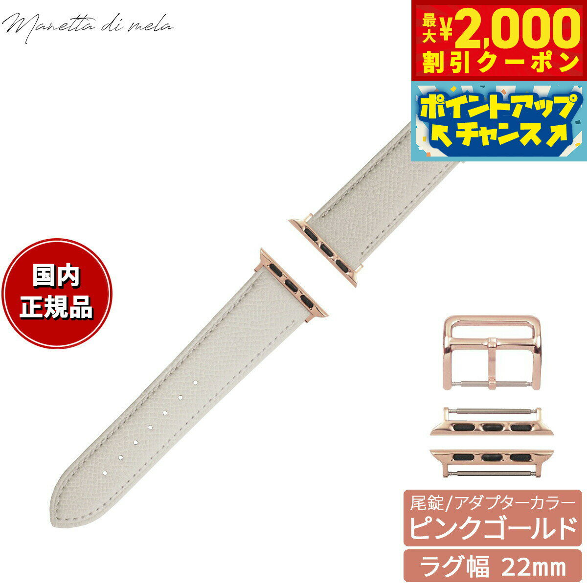 【最大2000円OFFクーポン!&店内ポイント最大52倍!本日限定!】マネッタ ディ メーラ Manetta di mela アップルウォッチ Apple Watch 替えバンド ベルト メンズ レディース ワープロラックスカーフレザー 22mm シルキーホワイト/ピンクゴールド EWB-WH-P22 10,450 ~