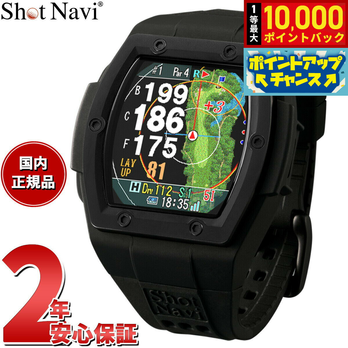 腕時計型ゴルフナビ最大サイズ1.4インチ液晶ディスプレイ。 Dynamic Green Eye、フェアウェイナビ(特許取得)、オートメジャー、オートビューチェンジ、グリーンディレクション、レイアップナビ機能搭載。 MIPカラー反射型液晶。 高精度測位みちびきL1S、ガリレオ、グロナス対応。 腕時計型GPSゴルフナビ。 日本プロゴルフ協会推薦品。 国内100%&海外のゴルフ場に対応。 商品名ショットナビ Shot Navi Evolve α エボルブ アルファ 腕時計型 GPS ゴルフナビ 距離測定器 距離計測器 ブラック商品番号EVOLVE-A-Bブランドショットナビ Shot Naviムーブメントクォーツ(充電式リチウムイオン電池) 【本体仕様】■ディスプレイ:MIPカラー反射型液晶■防水:IPX7 (生活防水程度)■フル充電時間:3時間(PC経由時)■使用時間:GPS使用時 最大約9時間 / 時計モード 最大約20日■データ更新:Windows専用ツールによるダウンロード■対応衛生:GPS、GLONASS、みちびき、Galileo ■グリーンの起伏が分かる Dynamic Green Eye■超高精度 マルチ衛星ナビ■オートメジャー■グリーンディレクション■レイアップナビ■オートビューチェンジ■フェアウェイナビ(特許取得済)■同心円■ドライビングレイアップサークル■水平・目安距離表示■高低差■推奨番手■コースレイアウト表示(国内100%対応)■どでか文字ビュー■USB Type-C充電■Made in Japan※競技モードでご使用のときはDynamic Green Eyeは表示しません。 ※短い距離のアプローチやパターなどは検知しない場合があります。 ※国内・海外共にコース数は9ホール(OUT/INなど)を1コースと表示しております。 ※出荷時は、日本・アジア・ハワイ・グアム・サイパンのコースのみ収録されています。 その他の海外のコースは、パソコンまたはスマートフォンアプリよりダウンロードしてください。 ※バッテリーの連続使用時間は使用機能・期間などにより変化します。 風防素材強化ガラスケース素材PC-ABSケースサイズ47.5×47.5mmケース厚13.2mmバンド素材シリコンバンド留金タイプ尾錠バンド幅21mm腕周り(最大)20cm本体重量63g保証期間メーカー1年間保証付属充電/通信用USBケーブルType-C、クイックスタートガイド兼保証書、ウォッチケースその他のサービスショットナビ Shot Navi Evolve α エボルブ アルファ 腕時計型 GPS ゴルフナビ 距離測定器 距離計測器 ブラック腕時計型ゴルフナビ最大サイズ1.4インチ液晶ディスプレイ。 Dynamic Green Eye、フェアウェイナビ(特許取得)、オートメジャー、オートビューチェンジ、グリーンディレクション、レイアップナビ機能搭載。 MIPカラー反射型液晶。 高精度測位みちびきL1S、ガリレオ、グロナス対応。 腕時計型GPSゴルフナビ。 日本プロゴルフ協会推薦品。 国内100%&海外のゴルフ場に対応。