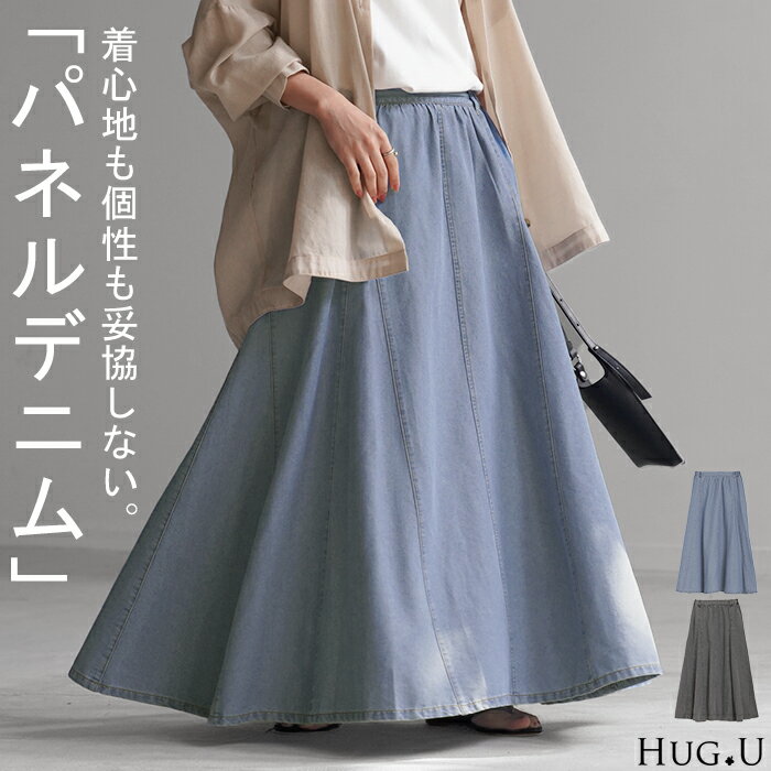スカート デニム ロング レディース ボトムス ロングスカート デニムスカート マキシスカート ハイウエスト パネル フレア フレアスカート 無地 綿 混 ウエストゴム Aライン マキシ ゆったり 体型カバー ゆったり 大きいサイズ ブルー 黒 春 夏 HUG.U 4,980 ~