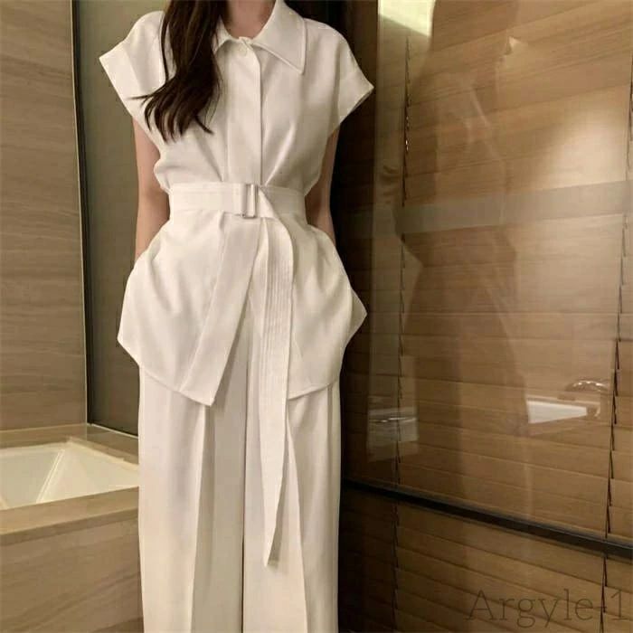 シャツ 【送料無料】セットアップ パンツスーツ ワイドパンツ パンツセット 2点セット レディース ノースリーブ 新作 無地 ベルト 折り襟 6,951 ~