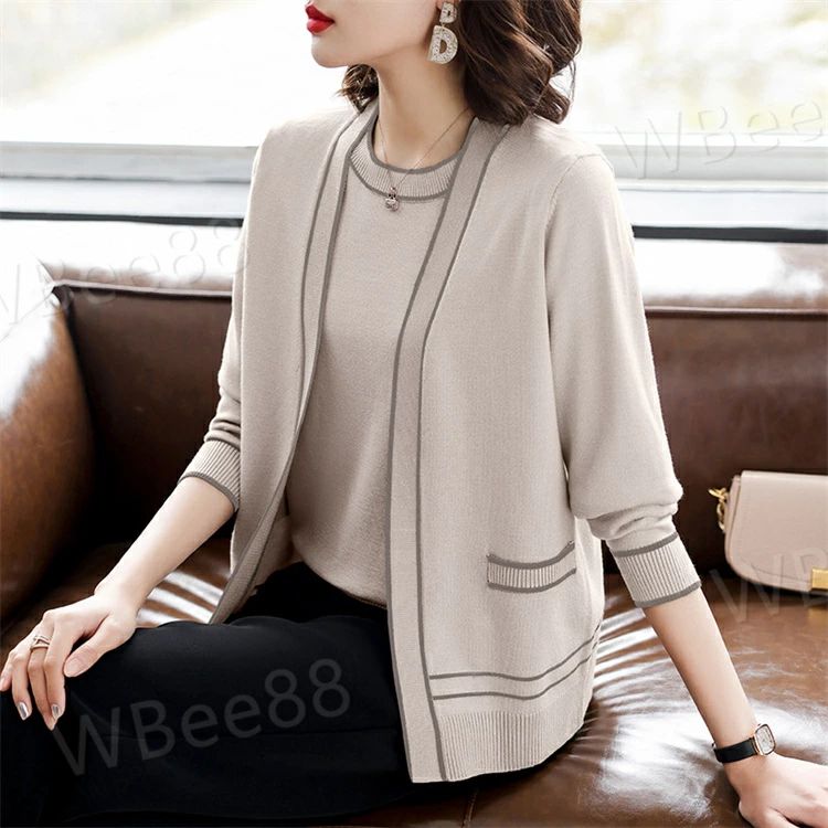 セーター 半袖 婦人 母の日 2点セット 上品 プレゼント ライン入り 通勤 上着 ギフト きれいめ ニット オフィス トップス カジュアル アウター 丸首 カーディガン クルーネック アンサンブル ニット 5,080 ~