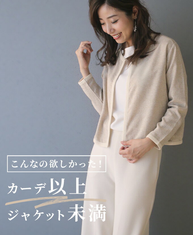 Styling Point こんなの探してた! ジャケットに変わるきちんと羽織! 『ジャケットだとかちっとしててしんどい』 『カーディガンだとカジュアルにみえる』 そんな時に! styleが提案するちょうどいいジャケカーデ ちょうどいいとは? カーディガン以上ジャケット未満 夏から秋にかけて新学期が始まり、 個人面談や会社の商談が多くなってくる今の時期・・・ 学校行事にも仕事にもOK! 気軽にきちんと感が出る 『ジャケカーデ』 なぜきちんと感が出るの? ノーカラー仕立て パイピングが上品な雰囲気 首元がすっきりとした印象に なるので簡単にきれいめな着こなしに パイピングを施し華やぎ感&上品な印象に。 このインナー合わせが素敵 丸首・タートル・ボウタイ ※ VネックはNG!首元にスカーフを巻いて華やかに◎ ジャケット→堅苦しい重たいイメージ カーディガン→カジュアル見えするイメージ ジャケカーデ→きちんと感と楽さが手に入る! 魅力たっぷり ジャケカーデのここが素敵 肩パットなし・裏地なし・薄手で軽い だから!とっても楽! 着心地も良く軽くて『肩も凝らない』 さらに!ストレッチが少ないので 形をキープしやすい! これだったら『長く使える』 まだ暑い時期は涼しく着られて 寒くなったらコートの中に着てもかさばりません! しっかりめな手触りで、伸縮性はありません。 薄手で織生地の風合いが素敵な カーディガンです。 ジャケカーデの着こなし方大公開! テーパードパンツ・フレアスカート・ワイドパンツ バランスがとりやすく相性◎ ガイド ベージュ ブラック 肌色 黒 beige black レディース アウター ジャケット カーディガン ジャケカーデ 羽織り 羽織 上着 重ね着 ライトアウター 軽アウター 長袖 長そで シュート丈 ノーカラージャケット ノーカラー オフィス オフィスカジュアル 大きいサイズ 大きい 大きめサイズ 大きめ ゆったり 丸首 クルーネック ラウンドネック 前開き ポケット ポケット付き サイドポケット カジュアル ナチュラル おしゃれ オシャレ 可愛い かわいい きれいめ キレイめ 上品 シンプル ニュアンスカラー フリーサイズ オールシーズン 入学 入学式 オケージョン卒業 卒業式 セレモニー 仕事 通勤 OL 学校行事 学校 参観日 七五三 お宮参り 保護者会 ママ 母 母親 服装 おうちコーデ おうち おうちスタイル 在宅 在宅ワーク テレワーク レイヤードスタイル ゆるコーデ きれいめカジュアル ファッション レディースファッション 着回し 春コーデ ラッピング ギフト 有料ラッピング プレゼント プレゼント包装 ギフト包装 Ehre style style エーレスタイル スタイル 送料無料 春 春服 春物 秋 秋服 秋物 冬 冬服 冬物 秋冬 服 新作 新着 洗濯 洗濯可 手洗い 30代 40代 50代着用アイテム ⇒ シフォンパンツ 着用アイテム ⇒ ブラウス / パンツ サイズ 肩幅 身幅 着丈 袖丈 アームホール 袖口 Free 40.5cm 53.5cm 53.5cm 52cm 45cm 22cm 透け感 (A)ややあり(B)なし 裏地 なし 厚み なし 伸縮性 なし 手洗い 可 素材 ポリエステル 65% ・ レーヨン 35% 重さ 約265g ポケット なし メール便 不可 生産国 韓国 サイズの測り方につきましては、統一しておりますが、若干の誤差が生じる場合や、 生産時期により、サイズが多少異なる場合がございます。 何卒ご了承くださいませ。 ▼詳しいサイズの測り方を見る▼ 再入荷についてはメルマガでお知らせしております。 ご登録はこちらから ジャケカーデ カーディガン パイピング 学校 ジャケット ベージュ ブラック きれいめ ノーカラー レディース フリーサイズ style スタイル 春 小柄さんもOK Ehrestyle【F200827】11/1再入荷 8,990 ~