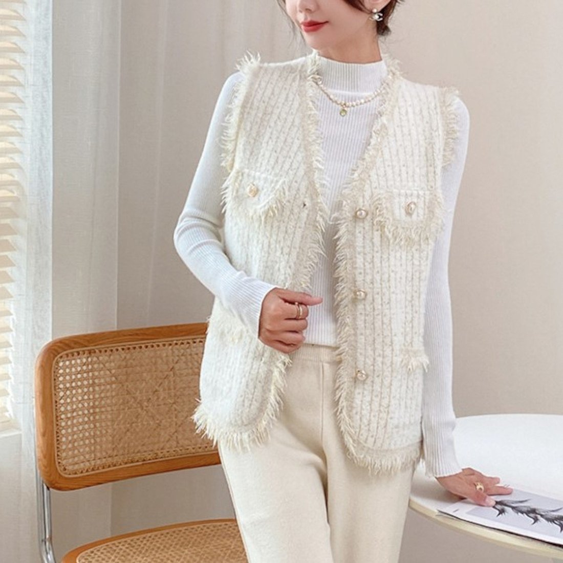[型番:f-top-0044-c]どんなコーデにも華やかさを演出してくれるフリンジ付きツイード風ジレが登場♪<br>フロントとポケットに付いているパールボタンが上品で大人可愛い印象を与えてくれます。 <br>ジレはジャケットより堅苦しすぎず、カジュアルアイテムとのレイヤードも気軽にできるのが◎<br>ブラウスを合わせたきれいめコーデから、Tシャツと合わせたカジュアルコーデまでスタイリングを選ばずお使いいただけます!<br><br>■注意事項<br>・お使いのモニターや端末により、質感・色合いが実際の商品と異なって見える場合がございます。 <br>・表記サイズは測り方によって1〜2cmの誤差が生じる場合がございます。 ご了承くださいませ。 ■カラー:ホワイト肩幅38cm バスト90cm 着丈62cm※( )で表記されている数字はヌードサイズです。 ヌードサイズとは衣服を身につけない身体のサイズです。 お客様ご自身の身体サイズと比較してお選びください。 ■素材: ポリエステル100% ■お手入: >>商品のお取り扱い方法 ■原産国: CHINAフリンジ付きツイード風ジレ/フォースメント(Forcement)ホワイト画面上と実物では、多少色具合が異なって見える場合がございます。