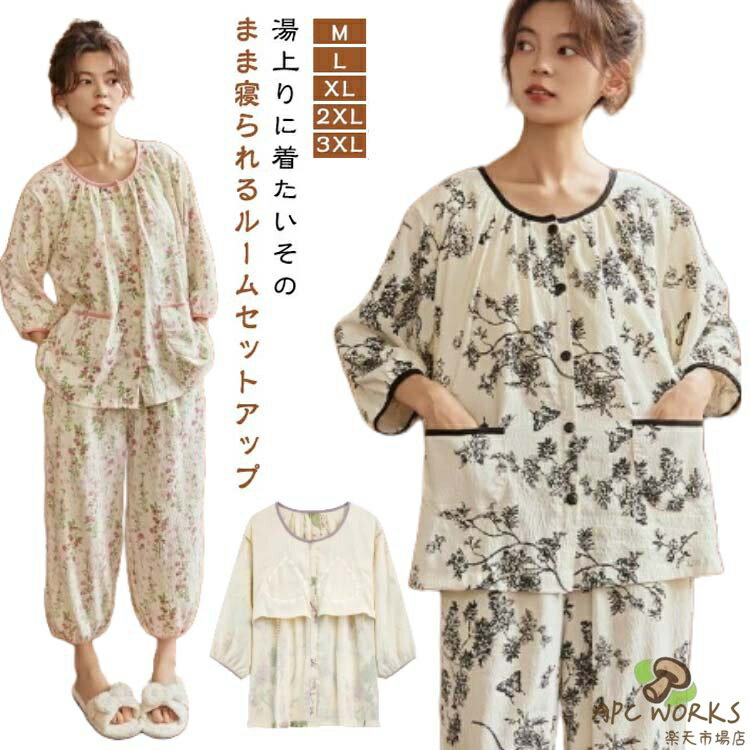 湯上がりパンツ レディース 部屋着 ルームセットアップ ルームウェア パジャマ カップ付き 長袖 前開き 7分袖 九分丈パンツ ノーカラー 花柄 かわいい ナイトウェア ゆったり 寝巻き 春 秋 夏 ギフト プレゼント 母の日