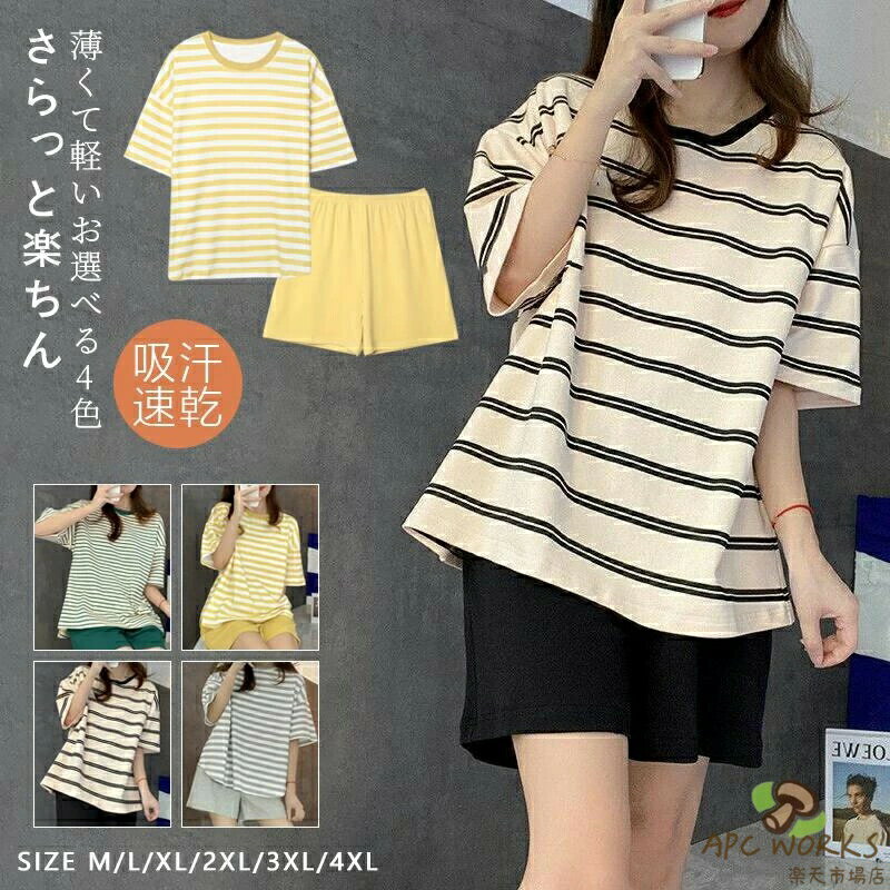 パジャマ ルームウェア レディース 冷感 ボーダー柄 半袖 カップ付き 寝巻き ひんやり 部屋着 薄手 おしゃれ ナイトウエア 丸首 女点セット 大きいサイズ 2025 新作