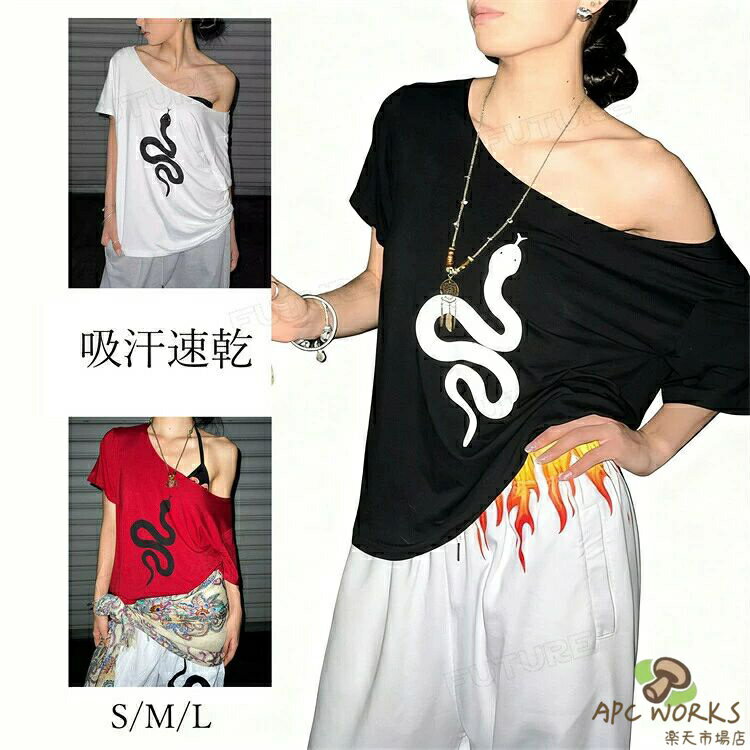 ダンス衣装 レディース キッズ 半袖 トップス Tシャツ tシャツ ヒップホップ ジャズダンス ゆったり 蛇柄 肩出し オフショルダー 黒 白 赤 韓国 k-pop アイドル風 iazz かわいい 練習着 レッスン着 演出服 発表会 ステージ衣装 イベント ストリート ガールズ hiphop kpop