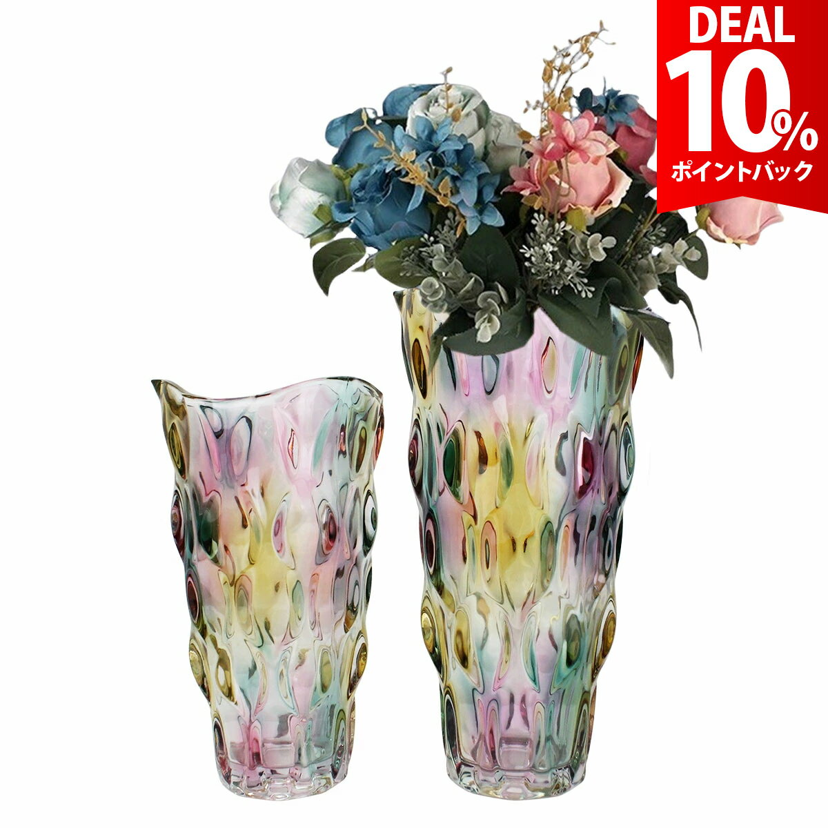 花瓶 2個セット おしゃれ フラワーベース ガラス 生け花 ドライフラワー 【 花瓶2サイズセット 】大・小2つのサイズの2点セットで、飾る場所に応じて雰囲気を演出できます。 【 大きさによって使い分け出来る 】背の高いお花や枝もの、ボリュームのある花束など、飾る花によって使い分けができて便利です。 【 高級感あふれるデザイン 】ガラスの美しいカットが輝きに満ちており、重厚感があり上品な印象です。 【 厚めのガラスで強い 】品質の高い厚めのガラスを使用し、重心があり安定性、耐久性も高い仕様です。 【 様々なシーンで大活躍 】和室にも洋室にも合わせやすい花瓶です。 生花を生けるのはもちろん、ドライフラワーや小物類のディスプレイにもおすすめです。 ご購入から30日間はメーカー保証付きです。 メーカー希望小売価格はメーカーサイトに基づいて掲載していますya198 【 花瓶2サイズセット 】大・小2つのサイズの2点セットで、飾る場所に応じて雰囲気を演出できます。 【 大きさによって使い分け出来る 】背の高いお花や枝もの、ボリュームのある花束など、飾る花によって使い分けができて便利です。 【 高級感あふれるデザイン 】ガラスの美しいカットが輝きに満ちており、重厚感があり上品な印象です。 【 厚めのガラスで強い 】品質の高い厚めのガラスを使用し、重心があり安定性、耐久性も高い仕様です。 【 様々なシーンで大活躍 】和室にも洋室にも合わせやすい花瓶です。 生花を生けるのはもちろん、ドライフラワーや小物類のディスプレイにもおすすめです。 ■セット内容■ 花瓶2個セット(大・小) ■サイズ(約)■ 大:高さ29cm 口径14cm 底径8cm 小:高さ23.5cm 口径13cm 底径7.5cm ■重量(約)■ 大:重量2188g 小:重量1502g ■素材■ 鉄・ガラス ※気泡や色むらなどがみられる場合がございます。 ご了承ください。 ※商品写真はできる限り実物の色に近づけるよう調整しておりますが、お客様のお使いのモニター設定、お部屋の照明等により実際の商品と色味が異なる場合がございます。 恐れ入りますが色味が理由によるご返品はお受けしておりませんので、予めご了承ください。 ご注文前にご確認下さい ●よくあるご質問● 【DEAL 10%還元】【2個セット】花瓶 おしゃれ フラワーベース ガラス 生け花 ドライフラワー 4,780 ~