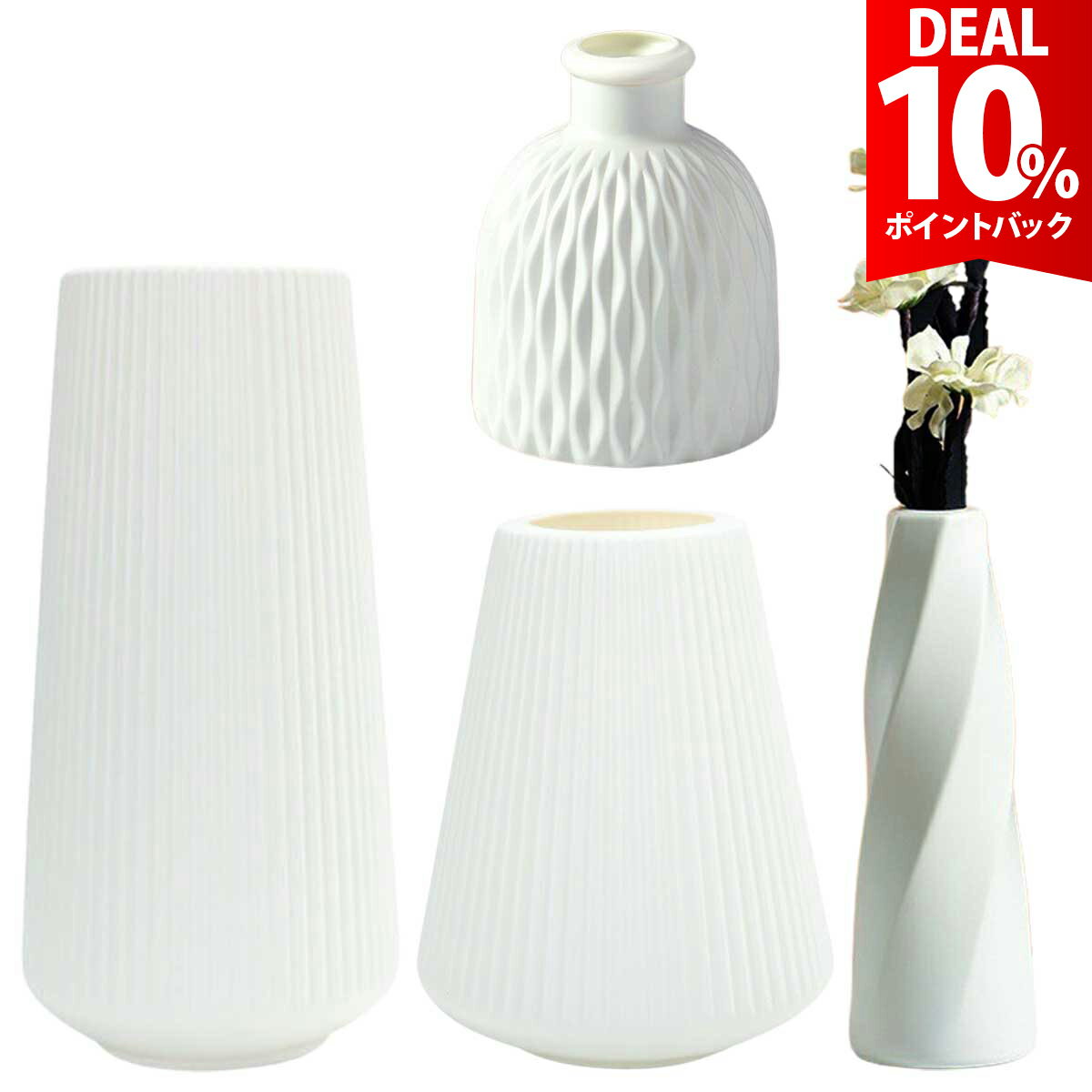 花瓶 割れない 4個セット おしゃれ フラワーベース プラスチック 白 生け花 ドライフラワー 【 花瓶4種類セット 】飾る場所に応じて使える4点セット。 飾る花、シーンに合わせてバランスよく飾ることができます。 【 割れないので取り扱い簡単 】軽量で割れにくいプラスチック製で、水の交換や移動も簡単で扱いやすいです。 小さな子どもやペットがいる家庭でも安心です。 【 安っぽく見えないリアルなデザイン 】陶器を思わせる重厚感があるデザインで、見た目にも機能的にも安定感のあるフラワーベースです。 【 状況に合わせて選べる 】部屋のテイストや花の種類などに合わせて使えます。 インテリアにも馴染みやすく、リビング・玄関・オフィスなど場所を問わず飾れるのも魅力です。 【 様々なシーンで大活躍 】和室にも洋室にも合わせやすい花瓶です。 生花を生けるのはもちろん、ドライフラワーや小物類のディスプレイにもおすすめです。 ご購入から30日間はメーカー保証付きです。 メーカー希望小売価格はメーカーサイトに基づいて掲載していますya199 【 花瓶4種類セット 】飾る場所に応じて使える4点セット。 飾る花、シーンに合わせてバランスよく飾ることができます。 【 割れないので取り扱い簡単 】軽量で割れにくいプラスチック製で、水の交換や移動も簡単で扱いやすいです。 小さな子どもやペットがいる家庭でも安心です。 【 安っぽく見えないリアルなデザイン 】陶器を思わせる重厚感があるデザインで、見た目にも機能的にも安定感のあるフラワーベースです。 【 状況に合わせて選べる 】部屋のテイストや花の種類などに合わせて使えます。 インテリアにも馴染みやすく、リビング・玄関・オフィスなど場所を問わず飾れるのも魅力です。 【 様々なシーンで大活躍 】和室にも洋室にも合わせやすい花瓶です。 生花を生けるのはもちろん、ドライフラワーや小物類のディスプレイにもおすすめです。 ■セット内容■ 花瓶4個セット ■サイズ(約)■ 別途画像を確認ください。 ■素材■ プラスチック ※商品写真はできる限り実物の色に近づけるよう調整しておりますが、お客様のお使いのモニター設定、お部屋の照明等により実際の商品と色味が異なる場合がございます。 恐れ入りますが色味が理由によるご返品はお受けしておりませんので、予めご了承ください。 ご注文前にご確認下さい ●よくあるご質問● 【DEAL 10%還元】【4個セット】花瓶 割れない おしゃれ フラワーベース プラスチック 白 生け花 ドライフラワー 4,199 ~