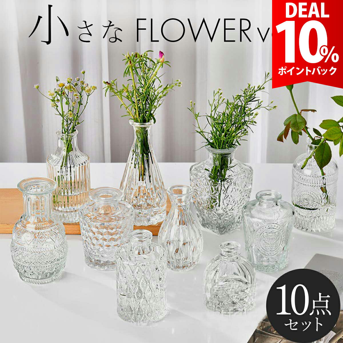 花瓶 小さい 10種類 セット おしゃれ フラワーベース ガラス 生け花 ドライフラワー 【 花瓶10種類セット 】異なるサイズや形状の花瓶の10点セット。 統一感のあるインテリアを演出できます。 【 状況に合わせて選べる 】部屋のテイストや花の種類などに合わせて使えます。 インテリアにも馴染みやすく、リビング・玄関・オフィスなど場所を問わず飾れるのも魅力です。 【 シンプル×上品なデザイン 】小ぶりで上品なフォルムのフラワーベースで、飾る部屋を選ばないさりげない存在感が魅力です。 一輪だけでもおしゃれに飾れる小さめサイズの花瓶です。 【 透明度も高く使いやすい 】クリアなガラス製で植物の全体を鑑賞できます。 透明感があるので中が見やすく、植物の清潔な状態を保てます。 【 様々なシーンで大活躍 】和室にも洋室にも合わせやすい花瓶です。 生花を生けるのはもちろん、ドライフラワーや小物類のディスプレイにもおすすめです。 ご購入から30日間はメーカー保証付きです。 メーカー希望小売価格はメーカーサイトに基づいて掲載していますya201 【 花瓶10種類セット 】異なるサイズや形状の花瓶の10点セット。 統一感のあるインテリアを演出できます。 【 状況に合わせて選べる 】部屋のテイストや花の種類などに合わせて使えます。 インテリアにも馴染みやすく、リビング・玄関・オフィスなど場所を問わず飾れるのも魅力です。 【 シンプル×上品なデザイン 】小ぶりで上品なフォルムのフラワーベースで、飾る部屋を選ばないさりげない存在感が魅力です。 一輪だけでもおしゃれに飾れる小さめサイズの花瓶です。 【 透明度も高く使いやすい 】クリアなガラス製で植物の全体を鑑賞できます。 透明感があるので中が見やすく、植物の清潔な状態を保てます。 【 様々なシーンで大活躍 】和室にも洋室にも合わせやすい花瓶です。 生花を生けるのはもちろん、ドライフラワーや小物類のディスプレイにもおすすめです。 ■セット内容■ 花瓶10個セット ■サイズ(約)■ 別添の画像をご確認ください。 ■素材■ ガラス ※製造ロットにより、若干の色差がございます。 予めご了承くださいませ。 ※商品写真はできる限り実物の色に近づけるよう調整しておりますが、お客様のお使いのモニター設定、お部屋の照明等により実際の商品と色味が異なる場合がございます。 恐れ入りますが色味が理由によるご返品はお受けしておりませんので、予めご了承ください。 ご注文前にご確認下さい ●よくあるご質問● 【DEAL 10%還元】【10種類セット】花瓶 小さい おしゃれ フラワーベース ガラス 生け花 ドライフラワー 3,999 ~