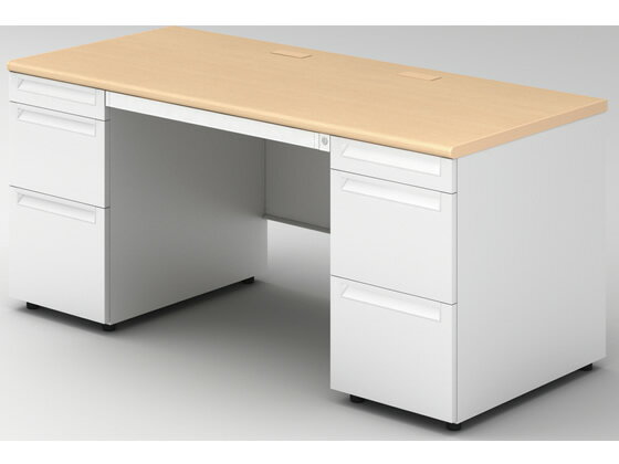 【商品説明】袖の引出は片側がD−3(下段がB4対応)タイプ、片側がA−3(中段と下段がA4対応)タイプです。 【仕様】●外寸法:幅1600×奥行700×高さ720mm●天板厚さ:30mm●下肢空間寸法:幅806×奥行617×高さ645mm●引出内寸法:(上段)幅328×奥行442×高さ72mm(中段)幅328×奥行442×高さ239mm(下段)幅317×奥行527×高さ295mm、センター引出/幅715×奥行382×高さ42mm●材質:天板/(表面)メラミン樹脂化粧版、脚・引出/鋼板(焼付塗装)●質量:78.2kg●耐荷重:天板/約140kg●引出ロック方法:ワンアクションロック●機能:全段ラッチ付、開閉表示付●カラー:ホワイトメープル●付属品:鍵(2個)、仕切り板(3枚)、ペントレー(2個)、センタートレー(1個)●生産国:日本●組立設置サービス●注文単位:1台●グリーン購入法適合●品番:US−NS167D−33 WS/W4※受注生産品につき、ご注文以降キャンセルを承ることができかねます。 【検索用キーワード】ぷらす PLUS ユーエスツー US2 オフィスデスク 事務机 幅1600 奥行700 高さ720 幅1600×奥行700×高さ720 ワンアクションロック ラッチ機構 カギ付き 鍵付き 開閉表示付 内筒交換 事務用デスク US−S167D−33−WMW4 USS167D33WMW4 669678 デスク ワゴン スチールデスク WW16 R13383デスク上のレイアウトが自由に行える配線口仕様。
