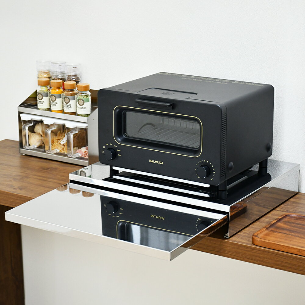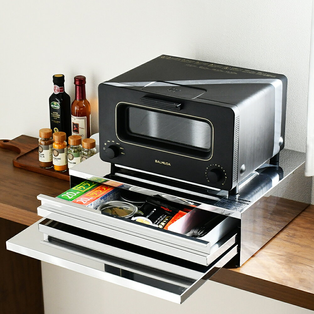 必要な時だけ引き出して使える便利なキッチンスライドテーブルです。 電子レンジや炊飯器などの下のスペースを有効活用できます。 引き出し収納付きで、ラップ、丸皿、カトラリーなどちょっとしたキッチン用品を収納することができます。 設置方法は家電の下に置くだけで、組み立て不要の完成品です。 底面は滑り止めシール、引き出しにはストッパー付き。 耐熱・耐久性と高級感に優れるステンレス棚板。 錆にも強く、お手入れしやすいのも高ポイント。 スライド棚下の空間にはオーブントレーや料理本などを収納するスペースがあります。 【本体】約幅55×奥行38×高さ13.5cm 【天板スペース】約55×38cm 【引き出し内寸】約50.5×35.5×5cm 【スライド棚内寸】約54×24cm 【梱包時】約58×40×高さ14cm 【重量】約5.3kg(梱包時:約6.1kg) 【耐荷重】天板 約 30kg、スライド棚 約 3kg、引き出し 約 3kg 【材質】ステンレス 日本製 ・必ず約3kg以上(推奨約5kg)の家電を載せてご使用ください。 ・転倒する可能性があるためスライド棚には手をつかないでください。 ・スライド棚は両手でゆっくり引き出してください。 ・完成品。 ・メーカー直送のため、お届けまでにお時間がかかる場合があります。 ・他商品との同梱はできません。