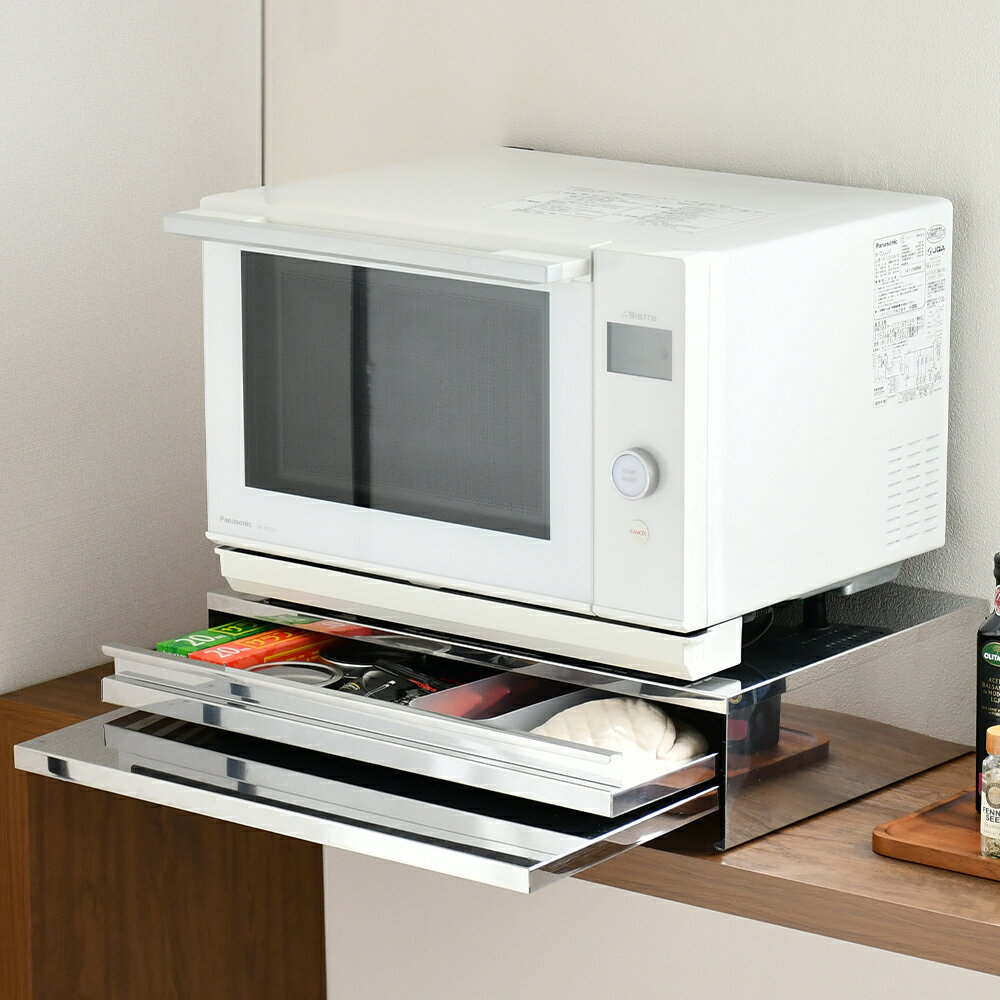 必要な時だけ引き出して使える便利なキッチンスライドテーブルです。 電子レンジや炊飯器などの下のスペースを有効活用できます。 引き出し収納付きで、ラップ、丸皿、カトラリーなどちょっとしたキッチン用品を収納することができます。 設置方法は家電の下に置くだけで、組み立て不要の完成品です。 底面は滑り止めシール、引き出しにはストッパー付き。 耐熱・耐久性と高級感に優れるステンレス棚板。 錆にも強く、お手入れしやすいのも高ポイント。 スライド棚下の空間にはオーブントレーや料理本などを収納するスペースがあります。 【本体】約幅45×奥行38×高さ13.5cm 【天板スペース】約45×38cm 【引き出し内寸】約40.5×35.5×5cm 【スライド棚内寸】約44×24cm 【梱包時】約48×40×高さ14cm 【重量】約4.5kg(梱包時:約5.2kg) 【耐荷重】天板 約 16kg、スライド棚 約 3kg、引き出し 約 3kg 【材質】ステンレス 日本製 ・必ず約3kg以上(推奨約5kg)の家電を載せてご使用ください。 ・転倒する可能性があるためスライド棚には手をつかないでください。 ・スライド棚は両手でゆっくり引き出してください。 ・完成品。 ・メーカー直送のため、お届けまでにお時間がかかる場合があります。 ・他商品との同梱はできません。