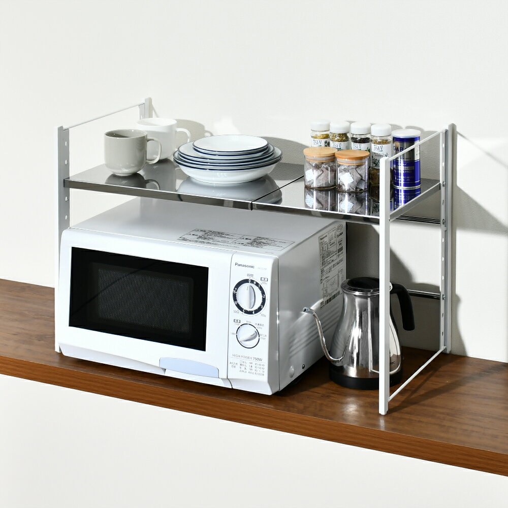限られたスペースも余すことなく使いたい方におすすめなカウンター上収納ラック。 2段タイプ 置くだけの簡単設置で、釘やネジでの固定は不要です。 耐熱・耐久性と高級感に優れるステンレス棚板。 錆にも強く、お手入れしやすいのも高ポイント。 幅は無段階の伸縮式で45〜72cmまで伸縮します。 棚板は4cmピッチで可動します。 【本体】約幅45.5〜72cm×奥行35cm×高さ69.5cm 【内寸】約幅43.5〜70cm×奥行30cm、約6.6kg(梱包時約6.8kg) 【梱包時】約71.5×36.5×7cm 【材質】棚板:ステンレス、本体:スチール(メラミン塗装)、背補強:スチール(クロムメッキ) 日本製 ・組立品になります。 ・メーカー直送のため、お届けまでにお時間がかかる場合があります。 ・他商品との同梱はできません。