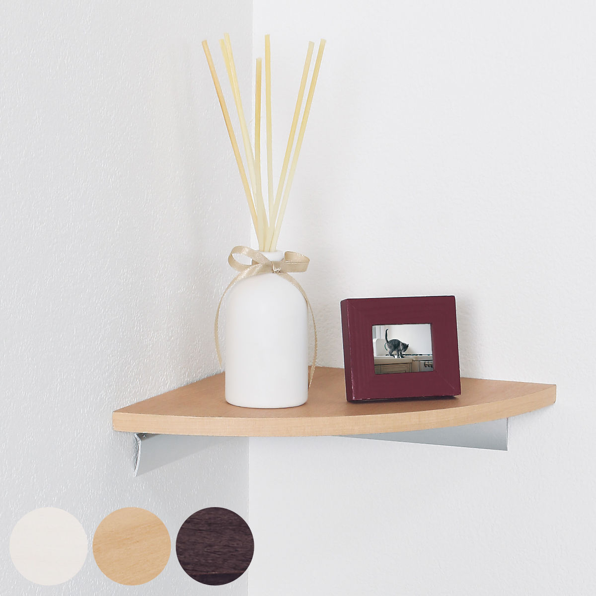 サイズ約 幅22×奥行22×高さ4.7(cm)重量約 0.5kg内容量1個付属品:石こうボード用ピン・木壁用ネジ材質アルミ・木質ボード種類アイボリー、ナチュラル、セピア備考・安全荷重:ピン・ネジ約5kg区分返品・キャンセル区分(小型商品)ギフトラッピングページを見る●簡易タイプのコーナー用飾り棚です。 ●石こうボード壁・ベニヤ壁・木壁・木桟に取り付けられます。 ●ちょっとしたインテリアを置くディスプレイに最適です。 ●コーナースペースを有効活用できる便利な棚です。 ●安全荷重は5kgです。 おすすめポイント壁のコーナー部分を有効活用スペースの空きがちな壁のコーナー部分に設置できるのでスペースを有効活用することが出来ます。 ベッド横のコーナーに設置して目覚まし時計を置いたり、トイレ室内のコーナーに芳香剤、玄関横のコーナーで鍵置きにすることもできます。 「棚があれば便利なのに…」っていうときに最適なアイテムです。 商品詳細カラーサイズシリーズ紹介カドアールシェルフ 22cmコーナーシェルフ 22cm関連キーワード:おしゃれ オシャレ 可愛い カワイイ かわいい 見せる収納 木目 石こう壁 石膏壁 木壁 対応 白 色 玄関 トイレ 寝室 キッチン 賃貸 取り付け 小物置き 小物収納 収納ディスプレイ ディスプレー 角 コーナー MR-4131、MR-4132、MR-4133 LH15297 LH792関連商品はこちらシェルフ 幅80cm ラージ 壁面収納 13,860円シェルフ 幅40cm ラージ 壁面収納 8,910円シェルフ 幅120cm ラージ 壁面収納 19,580円シェルフ 幅80cm アイアン 10,450円シェルフ 幅60cm アイアン 9,240円シェルフ 幅40cm アイアン 8,360円棚 壁掛け Pitfit ハングシェルフ L 8,380円シェルフ ロングシェルフ 120cm 壁付け 19,580円シェルフ ロングシェルフ 80cm 壁付け 棚13,860円シェルフ ロングシェルフ 60cm 壁付け 棚11,000円シェルフ ラウンドシェルフ 45cm 壁付け 5,500円シェルフ カドアールシェルフ 22cm 壁付け4,400円 コーナーシェルフ 飾り棚 壁面収納 ディスプレイ 木目調 ウォールシェルフ アイボリー ( 石膏ボード ウォールラック ディスプレイラック 木目柄 リビング 壁面 収納 シェルフ ディスプレイ棚 棚 壁収納 )【39ショップ】 3,740 ~