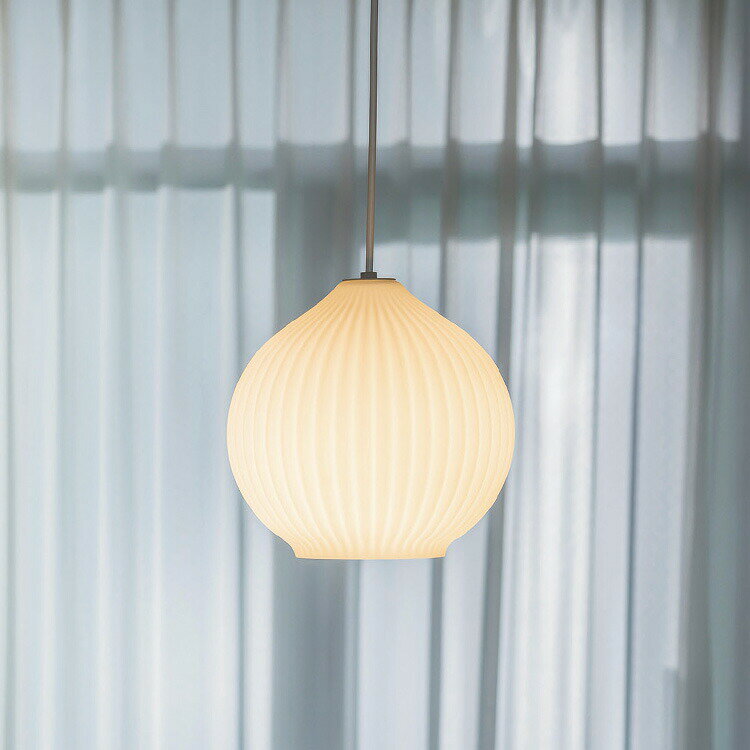 DETAILS・商品詳細 小さなたまねぎ「ペコロス」をデザインモチーフにしたペンダントライトのMサイズ。 心を和ませ、穏やかな雰囲気を感じさせるデザインで、親しみやすく、丸みを帯びたフォルムが特徴です。 触れたくなるようなさらさらとしたマットな質感のホワイトガラスを通して、陽だまりを思わせる灯りが優しく広がります。 繊維に見立てた縦のラインは、点灯しても陰影が消えないように深めに設計されており、消灯時には美しいコントラストが際立ちます。 小さな空間はもちろん、キッチンなどでの多灯使いにもぴったりなSサイズと、しっかりとした存在感があり、ダイニングやシンプルな空間のアクセントとしておすすめのLサイズの2サイズ展開です。 商品サイズ シェードサイズ/直径270×高さ260(mm) シーリングカバー/直径75×高さ105(mm) コード全高/465-1260(mm) 材質 スチール、ガラス 重量 1.6-1.7(kg) 仕様 口金 / E26 60W×1まで対応(電球別売) 対応電球サイズ / 直径60×110(mm)以下 白熱電球・LED電球使用可 壁スイッチ(点灯→消灯) 備考 お買い物の際の注意事項は、会社概要の「その他の注意点」を必ずご確認ください。 商品紹介 POINT 1:シンプルで飽きがこないデザイン 無駄のないすっきりとしたルックスは、長く愛用できる普遍的な魅力となります。 POINT 2:心地よい素材の組み合わせ 木の優しい素材感とガラスの透明感のバランスが、ナチュラルながらも洗練された雰囲気をもたらします。 POINT 3:複数使いもスマートなコンパクトサイズ 小ぶりなサイズは、一つでさりげないアクセントとなり、複数吊り下げてもすっきりとした印象でおしゃれな空間を演出できます。