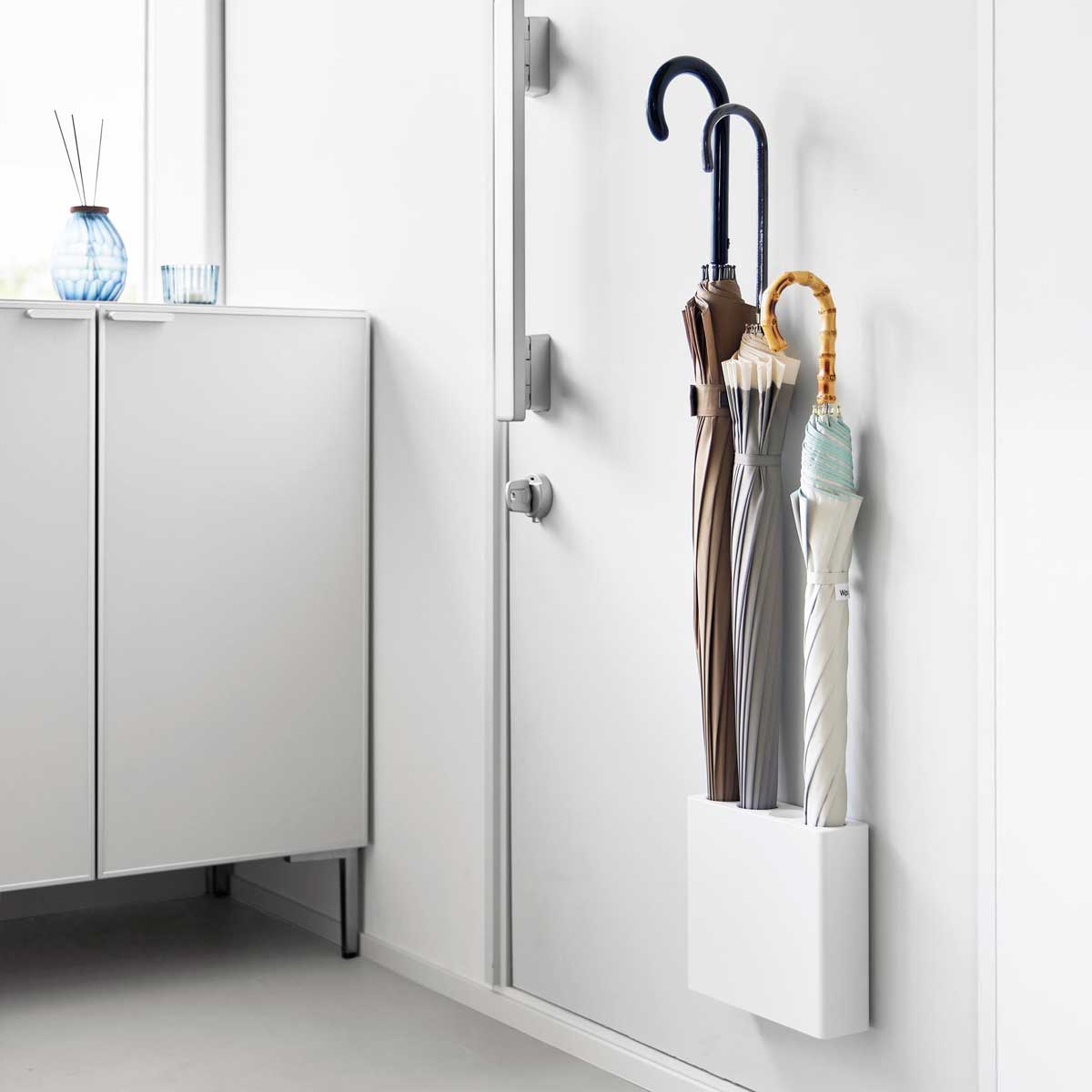 出し入れしやすい傘ホルダー 玄関ドアが傘の収納スペースになるアンブレラホルダー。 奥行きが約63mmのスリム形状で圧迫感なく設置できます。 傘をしっかりホールド、ドア開閉時に傘が落ちることなく安定して収納できます。 マグネットで簡単に取り付け シンプルな形状のアンブレラホルダーです。 マグネットの付くお好みの位置に取り付けることができ、サッと出し入れしやすいです。 先端の形状が異なる雨傘や日傘、子ども用の傘も収納可能です。 商品の情報 ・ブランド:YAMAZAKI(山崎実業)/日本 ・ジャンル:傘立て ・主な素材:ABS樹脂、マグネット(本体)/シリコーンゴム(滑り止め) ・生産国:中国 ・サイズ:約W210xD63xH190mm ・重量:約660g ・耐荷重:2kg(静止荷重) ・傘収納可能数:4本(長傘、折り畳み傘も可)※傘のサイズや形状によっては収納できない物もあります。 ・使用できる面:マグネットがつく平らな面 スチール面 この商品の仲間たち smart スマート マグネットアンブレラホルダー 4連 10056 ホワイト smart スマート マグネットアンブレラホルダー 4連 10057 ブラック 傘立て 山崎実業 正規品 smart スマート マグネットアンブレラホルダー 4連 マグネット収納 壁付け 壁掛け 傘たて 傘スタンド 10056 ホワイト 3,080 ~
