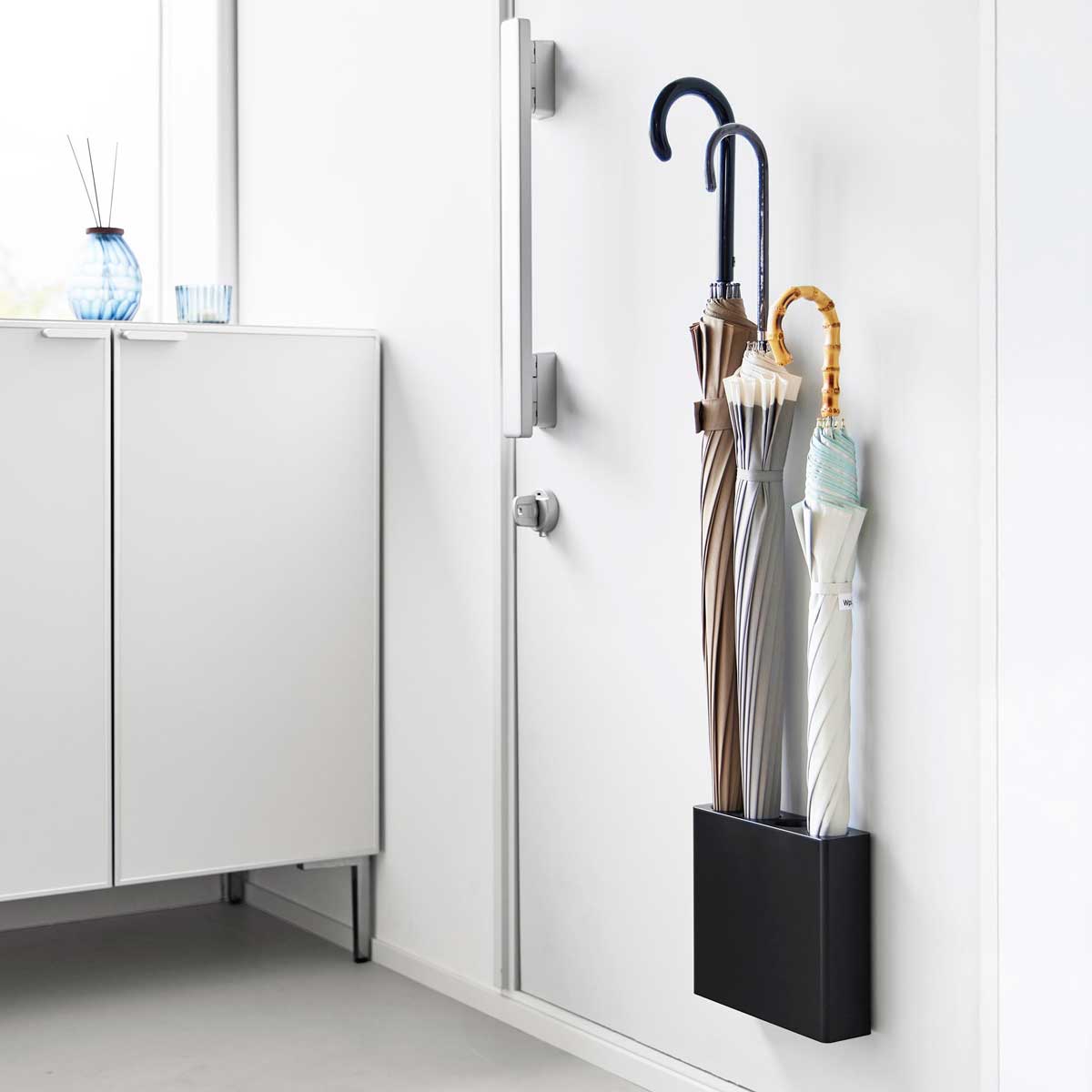 出し入れしやすい傘ホルダー 玄関ドアが傘の収納スペースになるアンブレラホルダー。 奥行きが約63mmのスリム形状で圧迫感なく設置できます。 傘をしっかりホールド、ドア開閉時に傘が落ちることなく安定して収納できます。 マグネットで簡単に取り付け シンプルな形状のアンブレラホルダーです。 マグネットの付くお好みの位置に取り付けることができ、サッと出し入れしやすいです。 先端の形状が異なる雨傘や日傘、子ども用の傘も収納可能です。 商品の情報 ・ブランド:YAMAZAKI(山崎実業)/日本 ・ジャンル:傘立て ・主な素材:ABS樹脂、マグネット(本体)/シリコーンゴム(滑り止め) ・生産国:中国 ・サイズ:約W210xD63xH190mm ・重量:約660g ・耐荷重:2kg(静止荷重) ・傘収納可能数:4本(長傘、折り畳み傘も可)※傘のサイズや形状によっては収納できない物もあります。 ・使用できる面:マグネットがつく平らな面 スチール面 この商品の仲間たち smart スマート マグネットアンブレラホルダー 4連 10056 ホワイト smart スマート マグネットアンブレラホルダー 4連 10057 ブラック 傘立て 山崎実業 正規品 smart スマート マグネットアンブレラホルダー 4連 マグネット収納 壁付け 壁掛け 傘たて 傘スタンド 10057 ブラック 3,080 ~