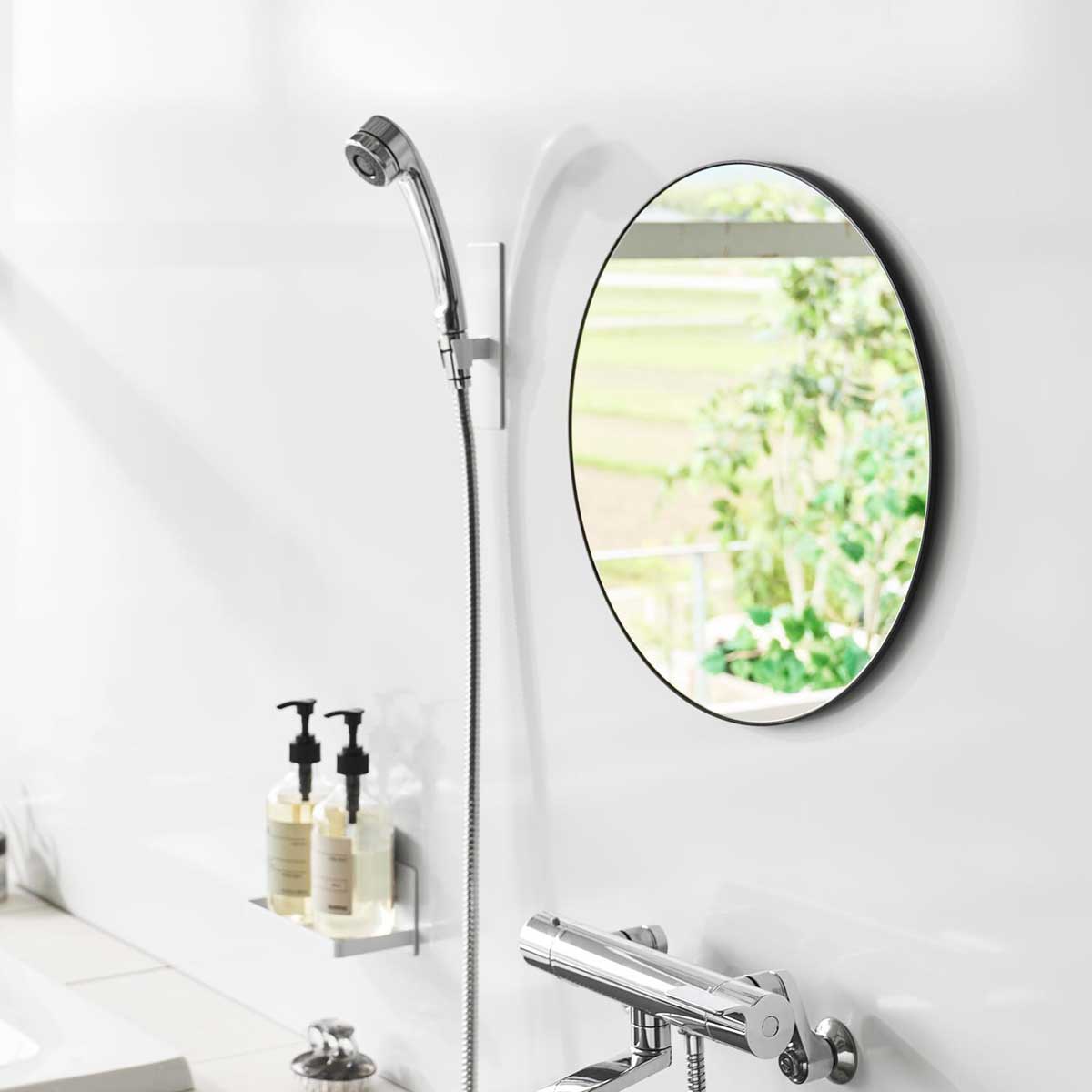 マグネットで簡単設置 美しく、透明感がある直径42cmの丸型ガラス製バスルームミラーです。 フレームと壁の隙間に指を入れて取り外しやすい形状なので、お掃除がしやすく清潔に保てます。 曇り止めフィルムを全面に粘着加工しているため、鏡面が曇らず快適にお使いいただけます。 商品の情報 ・ブランド:YAMAZAKI(山崎実業)/日本 ・ジャンル:浴室ミラー ・主な素材:ABS樹脂、マグネット(フレーム)/シリコーンゴム(滑り止め)/3mm厚ガラス(ミラー)/PET(表面フィルム) ・生産国:中国 ・サイズ:約W420xD14xH420mm ・重量:約1800g ・耐熱温度:90℃ ・耐冷温度:-40℃ ・使用できる面:マグネットがつく凹凸のない平らな面 スチール面 この商品の仲間たち tower タワー マグネットバスルームミラー 丸型 42cm 10177 ホワイト tower タワー マグネットバスルームミラー 丸型 42cm 10178 ブラック 浴室ミラー 山崎実業 正規品 tower タワー マグネットバスルームミラー 丸型 42cm マグネットで簡単設置 風呂鏡 マグネット設置 バスルームミラー 10177 ホワイト 14,850 ~