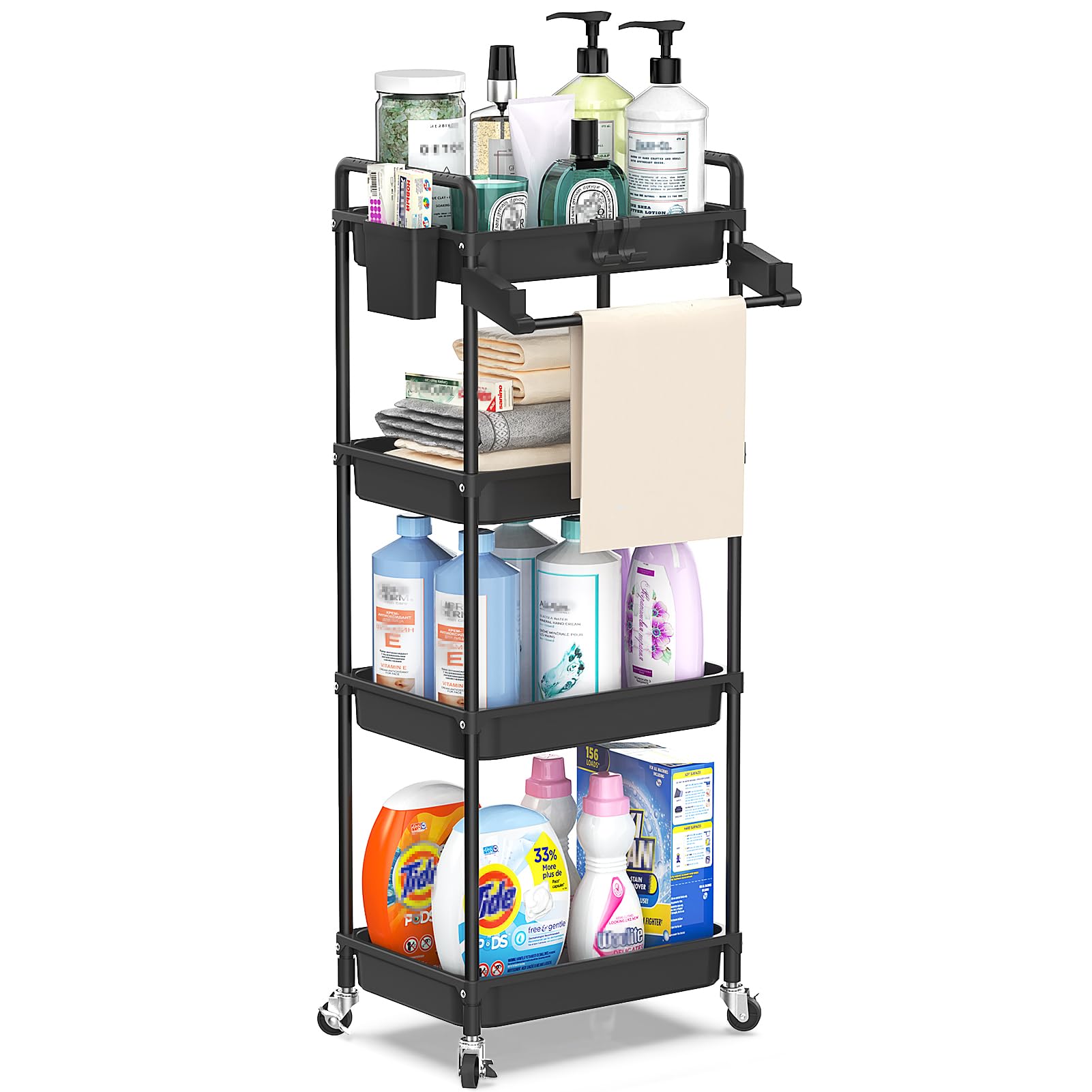 ・【高品質の家庭用収納 ワゴン】高級な材質は採用なので、高い安定性を誇ります。 スリムボディーをして、部屋の隙間に自在に配置されています。 トイレ収納、ベッドルーム、居間、子供部屋、キッチン、書店、美容室などの使用に最適して、収納力は抜群です。 いろんなシーンで大活躍なキッチンワゴンです。 ・【タオルラック付き・多機能で実用的】バスタオルはもちろん、フェイスタオルやバスマットなど、様々なサイズのタオルを掛けられます!横から掛けられるので、洗濯機横に設置しても使いやすく、デッドスペースを有効活用できます。 下着や靴下、子供服などを乾かすのに最適です。 ・【キャスター付き】4つのキャスター付きなので360°自由に回転し、楽に移動できます。 十分な静音だけでなく、安定性も抜群、平らでない表面でもぐらぐら揺れませんので安心的に移動できます。 本体は約3kgの軽量なので、持ち上げての移動もラクラクです。 ・【頑丈&耐久性】軽量で丈夫な素材でできたワゴンで、ご底板は穴付きで通気性がよく、お掃除が簡単で、湿気が多い場所でも安心。 また、落下防止フレーム付きがあり、小物や割れ物等落下の心配なく、ジャムなどの小さいものペットボトルなどの大きな物まで収納可能です。 ・【組み立て簡単】このキッチンワゴンは組み立て簡単、女性一人でも組み立てられます。 説明書に組み立て図解もあります。 段数を自由に決めて、一段、二段、三段でも使えます。 説明書に組み立て図解もあります。 SPACEKEEPER キッチンワゴン ビッグ 4段 タオルラック付き ブラック SPACEKEEPER キッチンワゴン [タオルラック付き] スリム 隙間収納 22cm 収納ラック キャスター付き 収納カート ローリングラック おしゃれ 調味料 食品 ペットボトル 小物 台所 洗面所 冷蔵庫横 4段 ブラック 3,874 ~