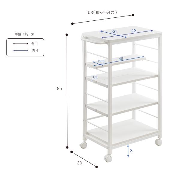 ■サイズ・色違い・関連商品■高さ約71cm ダークブラウン[当ページ]■高さ約71cm ホワイト■高さ約85cm ダークブラウン■高さ約85cm ホワイト関連商品の検索結果一覧はこちら■商品内容●必要な時に必要な場所へ。 取っ手とキャスター付きでらくらく移動。 ●ちょっとした隙間を有効活用できる、幅30.5cmのキッチンワゴン。 ●可動式の棚板3枚付き。 高さ9cm間隔で5段階の調節ができる自由度の高いワゴンです。 ●天板・棚板・底板は、耐水性のあるシートを使用していて、お手入れも簡単です。 ●標準的なダイニングテーブルの高さに合わせた設計で、テーブル横に置くと便利です。 ●耐荷重:天板5kg、底板5kg、棚板1枚3.5kg、全体耐荷重20kg■商品スペック■サイズ(約)幅53×奥行30.5×高さ71cm■重量(約)8.1kg■材質(本体)スチール・粉体塗装(天板・棚板・底板)化粧繊維板(キャスター)樹脂■生産国中国【ご注意事項】・本品はお客様にて組立ての作業が必要となります。 ・商品の組立て開始前に、部材不足・破損がないか必ずご確認ください。 ■送料・配送についての注意事項●本商品の出荷目安は【1 - 4営業日 ※土日・祝除く】となります。 ●お取り寄せ商品のため、稀にご注文入れ違い等により欠品・遅延となる場合がございます。 ●本商品は仕入元より配送となるため、沖縄・離島への配送はできません。 [ KW-0930 DBR W ] キッチン収納 キッチンワゴン 約幅53cm ダークブラウン スチール 可動棚付 キャスター付 取っ手付 収納家具 組立品 6,510 ~