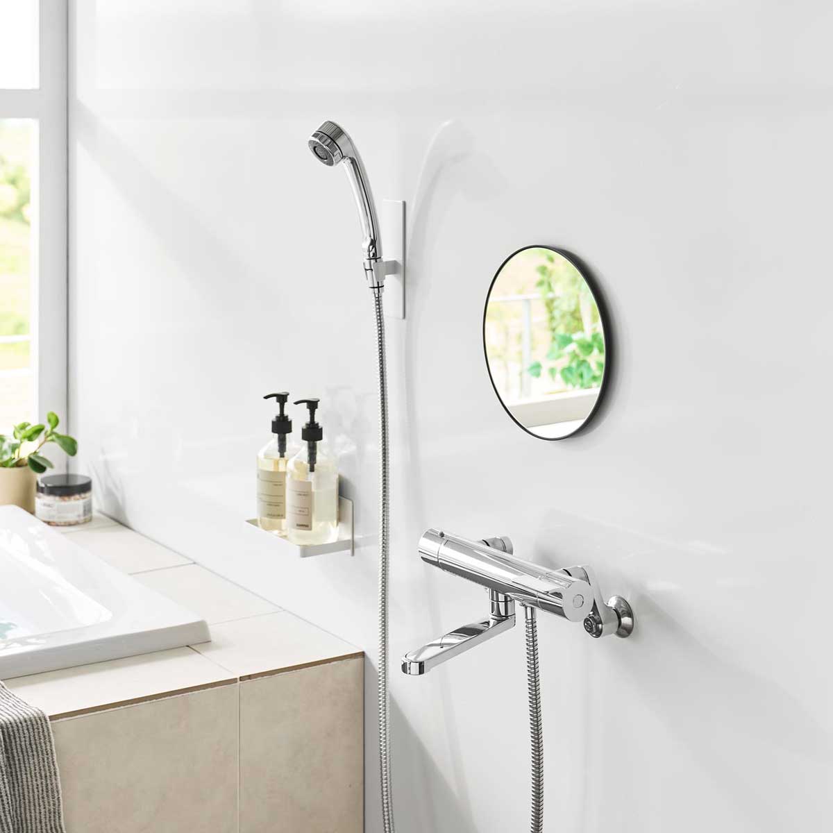マグネットで簡単設置 美しく、透明感があるロングサイズの角型ガラス製バスルームミラーです。フレームと壁の隙間に指を入れて取り外しやすい形状なので、お掃除がしやすく清潔に保てます。曇り止めフィルムを全面に粘着加工しているため、鏡面が曇らず快適にお使いいただけます。 商品の情報 ・ブランド:YAMAZAKI(山崎実業)/日本 ・ジャンル:浴室ミラー ・主な素材:ABS樹脂、マグネット(フレーム)/シリコーンゴム(滑り止め)/3mm厚ガラス(ミラー)/PET(表面フィルム) ・生産国:中国 ・サイズ:約W205xD14XH605mm ・重量:約1600g ・耐熱温度:90℃ ・耐冷温度:-40℃ ・使用できる面:マグネットがつく凹凸のない平らな面 スチール面 この商品の仲間たち tower タワー マグネットバスルームミラー 角型 ロング 10308 ホワイト tower タワー マグネットバスルームミラー 角型 ロング 10309 ブラック 浴室ミラー 山崎実業 正規品 tower タワー マグネットバスルームミラー 角型 ロング マグネットで簡単設置 風呂鏡 マグネット設置 大きめ バスルームミラー 10308 ホワイト 14,300 ~