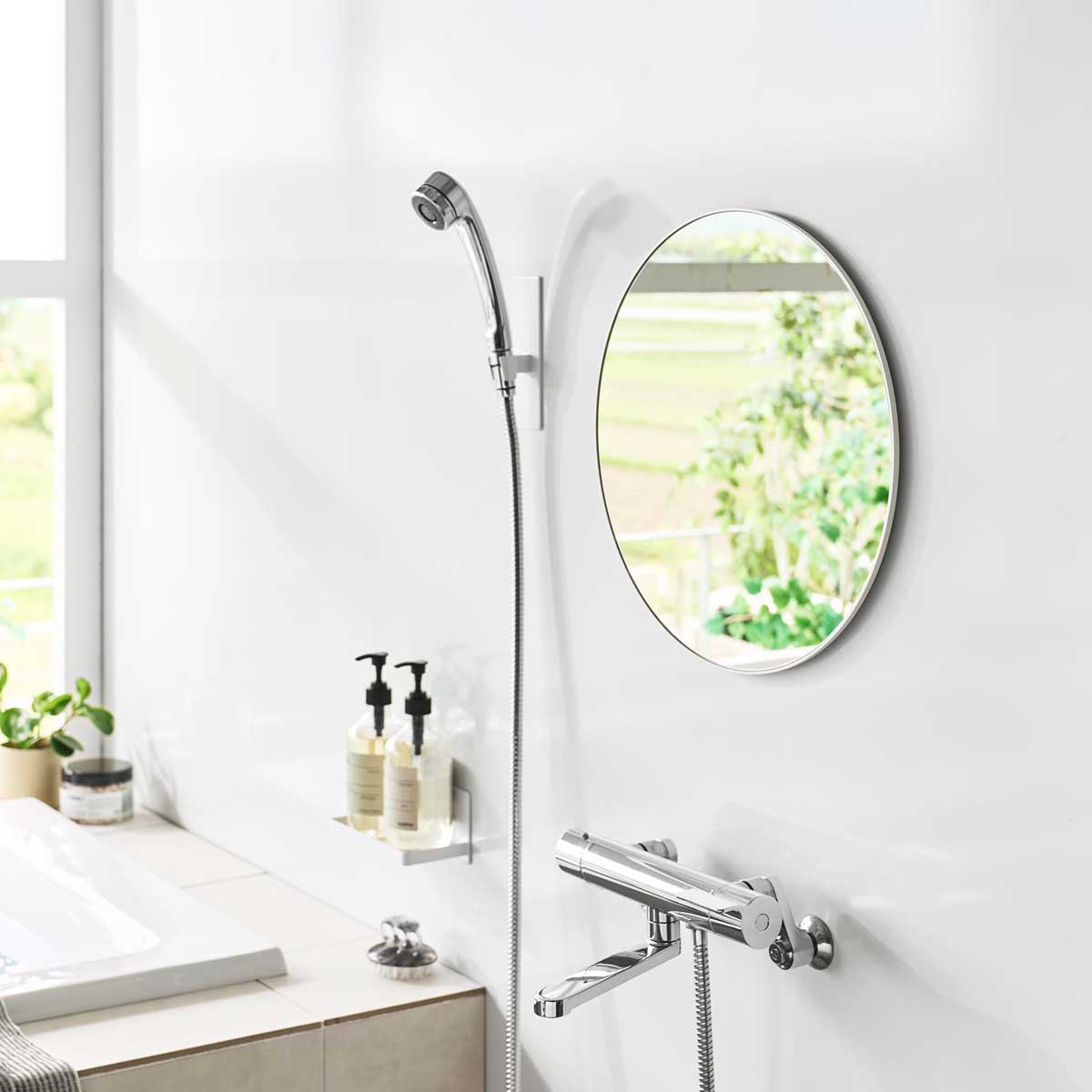 マグネットでお好みの場所に設置 軽量で割れない、樹脂製の小さなマグネット丸型ミラー。バスルームに簡単に設置できる、直径約42cmのマグネット丸型バスルームミラーです。厚さ6mmの樹脂製ミラーで、ゆがみにくく衝撃にも強い仕様です。 軽量でクリアな映りの樹脂ミラー マグネットでお好みの場所に簡単に設置でき、フレームと壁の隙間に指を入れて取り外しやすい形状で、お掃除がしやすく清潔に保てます。曇り止めフィルムを全面に粘着加工しているため、鏡面が曇らず快適にお使い頂けます。 商品の情報 ・ブランド:YAMAZAKI(山崎実業)/日本 ・ジャンル:バスルームミラー ・主な素材:ABS樹脂、マグネット(フレーム)/シリコーンゴム(滑り止め)/ポリスチレン(ミラー)/PET(表面フィルム) ・生産国:中国 ・サイズ:約W423xD14XH423mm ・重量:約1600g ・耐熱温度:70℃ ・耐冷温度:-40℃ ・使用できる面:マグネットがつく凹凸のない平らな面、スチール面 この商品の仲間たち tower タワー マグネットバスルーム樹脂ミラー 丸型 42cm 10173 ホワイト tower タワー マグネットバスルーム樹脂ミラー 丸型 42cm 10174 ブラック 浴室くもり止めミラー 山崎実業 正規品 tower タワー マグネットバスルーム樹脂ミラー 丸型 42cm マグネットでお好みの場所に簡単設置 樹脂製ミラー 曇り止め プラスチックミラー 10173 ホワイト 12,650 ~