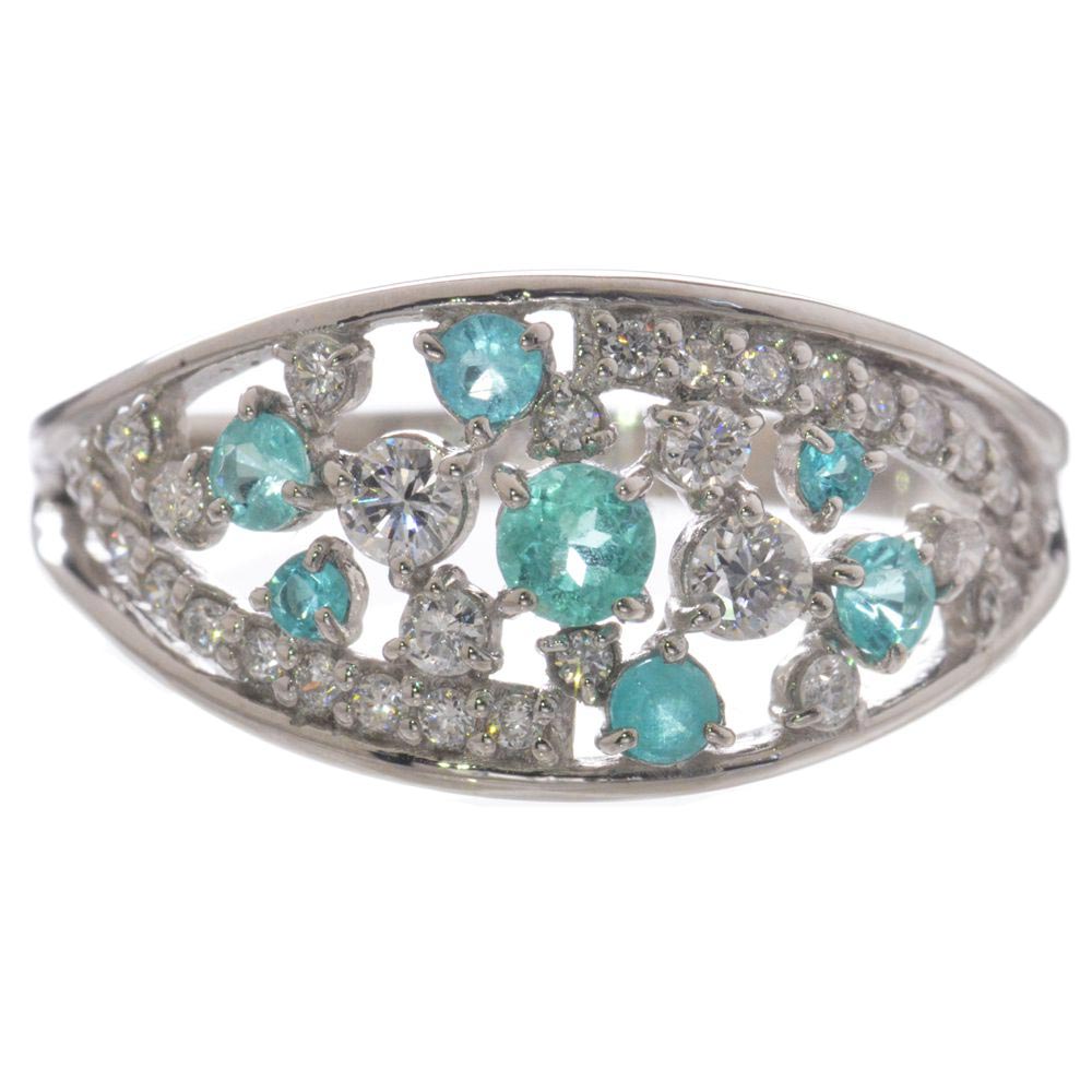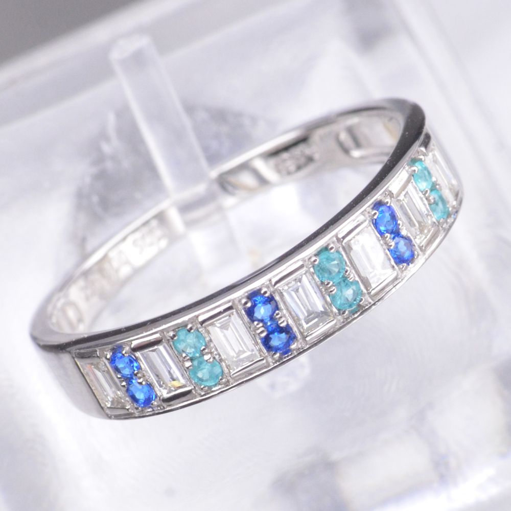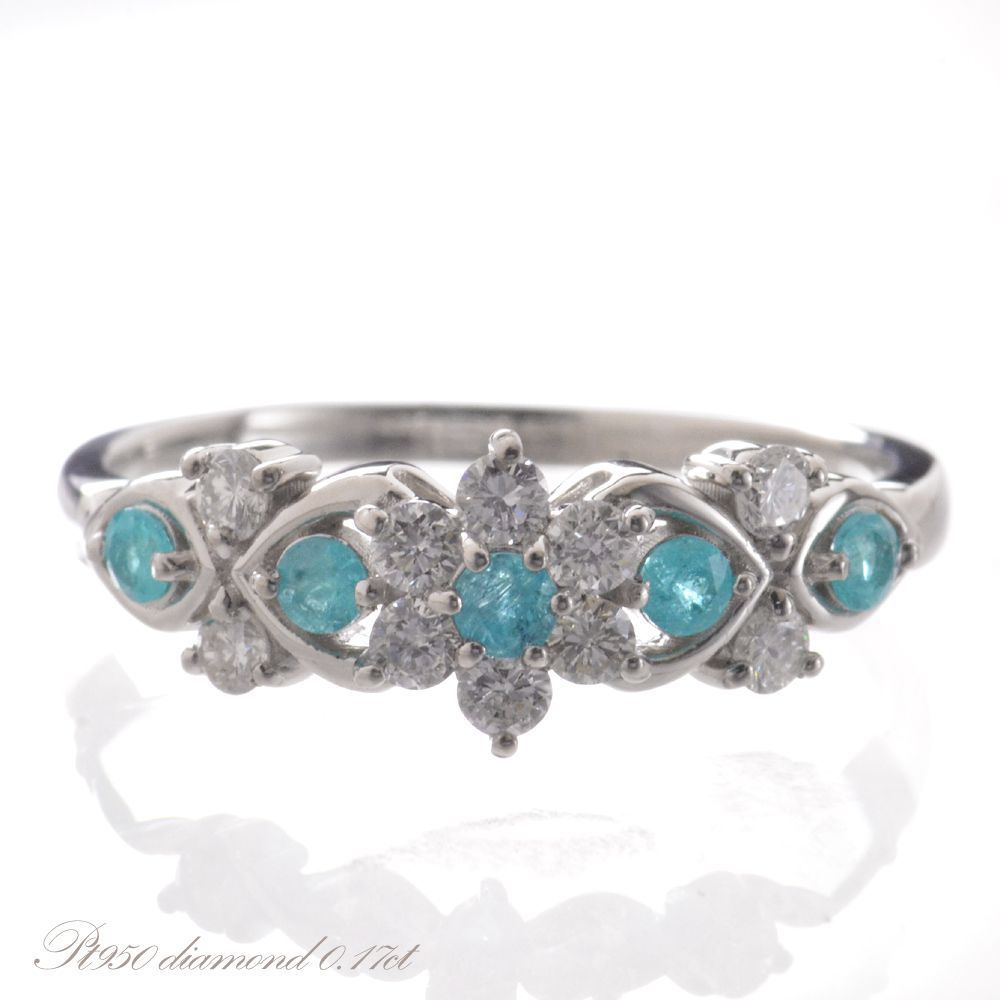 商品番号 DXD00050 使用貴金属 Pt950(プラチナ950) 使用石 パライバトルマリン計0.19カラット ダイヤモンド計0.09カラット 総重量 約2.3g(12号にて計量しています) サイズ 幅:(リング上部)約3.1mm(リング下部)約1.4mm厚み:(リング上部)約2.1mm(リング下部)約1.0mm 付属品 鑑別書 ジュエリーケース 備考 納期4週間(受注生産品・商品代引不可)※使用石と重量は若干上下する場合がございます。 パライバトルマリンのカラーは成分の違いにより、主にブルー系とグリーン系があります。 それぞれに美しさがありますが南国の海を思わせるネオンブルーと呼ばれるブルー系のパライバが一般的に価値希少性ともに高評価。 今回は透明感と照りを併せ持つルースを厳選して使用し、パライバの魅力を余すことなく堪能できるリングに仕上げました。 マテリアルは高純度のプラチナ950を使用し、ダイヤモンドも透明度の高いSIクラス程度で無色透明なものをセットしています。 ※カラーストーンの品質につきましては必ず商品画像と同程度のものを使用して作成致します。 色味や品質においてはご安心下さい。 Pt950 パライバトルマリン ダイヤモンド リング価格:152000円(税別) Pt950 パライバトルマリン ダイヤモンド フラワー リング価格:226000円(税別) Pt950 パライバトルマリン ダイヤモンド リング価格:132000円(税別) Pt950 パライバトルマリン ダイヤモンド リング価格:118000円(税別) Pt950 パライバトルマリン ダイヤモンド リング価格:122000円(税別) ■その他パライバトルマリンジュエリー一覧はこちら ■完全1点もの VIPセレクションパライバ プラチナ レディース 指輪 人気メンズジュエリー 人気レディースジュエリー 新作ジュエリー 喜平一覧 【マラソン同時開催★10%OFFクーポン】指輪 レディース パライバトルマリン リング プラチナ ダイヤモンド Pt950 ミル打ち 刻印入り 鑑別書付き 日本製 カラーストーン 308,000 ~