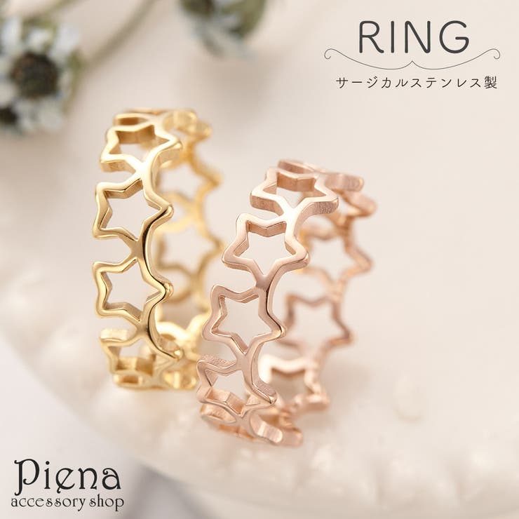 素材サージカルステンレス製サイズリングサイズ:7号9号 12号 15号 17号 19号 20号 22号リング太さ:約5.0mmリング厚み:約1.2mm星モチーフ直径:約5.2mm小さな星がぐるっと指を囲う可愛らしいリング。 透かし加工の抜け感あるオシャレなデザインです。 子供っぽくなりすぎず、 大人な女性を演出してくれます星モチーフ。 女性らしい華奢なフォルムでさりげなくデイリーに使えるかわいらしさ。 手元から華やかに仕上がるポイントアクセサリーです。 お肌に優しいサージカルステンレス製です。 素材はメスやハサミにも使用されているサージカルステンレスを使用していますので、金属アレルギーの方でもご使用頂けます。 (全ての方に金属アレルギーが出ない事を保障する物ではございません)返品・交換について購入後の交換は受け付けておりません。 予めご了承ください。 返品を希望される場合は購入履歴一覧の「ショップへの問い合わせ」よりお問い合わせください。 =========================複数配送先指定について1件の注文に対して、異なる住所への配送は対応出来かねます。 恐れ入りますが、異なる住所へ配送をご希望の場合、配送先毎に分けて注文いただきますようお願い申し上げます。 【アクセサリーWOMEN】ゴールド ピンクゴールド 7号 9号 12号 15号 17号 19号 22号 6号 20号 11号 18号 14号 5号 8号 【10%OFFクーポン!2/10(火)1:59まで】アクセサリーショップPIENA リング レディース サージカルステンレス製 星 スター 一周 透かし お肌に優しい 金属アレルギー対応 シンプル オシャレ 大人可愛い ペア お揃い 誕生日 記念日 指輪 1,098 ~