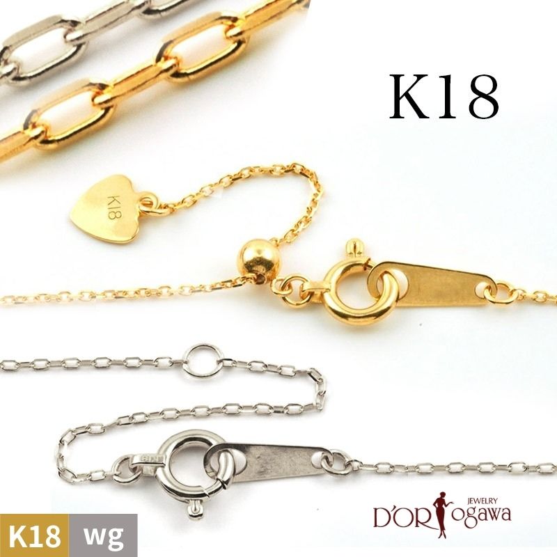 【素材】K18イエローゴールドまたはK18ホワイトゴールド カットアズキチェーン 【細目(線径:0.18mm)】 ◆長さ40cmタイプ(金具:アジャスタ管) 幅:約0.3mm | 重さ:約0.56g ◆長さ45cmタイプ(金具:スライドアジャスター) 幅:約0.3mm| 重さ:約0.67g ◆長さ50cmタイプ(金具:スライドアジャスター) 幅:約0.3mm| 重さ:約0.76g ※チェーンをネックレスのバチカンに通すプレートの大きさ:幅約2.7mm 長さ約7.5mm 【標準(線径:0.25mm)】 ◆長さ40cmタイプ(金具:アジャスタ管) 幅:約0.6mm| 重さ:約1.15g ◆長さ45cmタイプ(金具:スライドアジャスター) 幅:約0.6mm| 重さ:約1.35g ◆長さ50cmタイプ(金具:スライドアジャスター) 幅:約0.6mm| 重さ:約1.47g ※チェーンをネックレスのバチカンに通すプレートの大きさ:幅約3.0mm 長さ約8.6mm ※お取り寄せは約1週間、お作りの際は約1カヶ月となります。 シンプルなチェーンネックレスは、トップを通してアレンジが楽しめる必須アイテム。 45cm/50cmタイプはスライドアジャスターがあるので、お好みに合わせて調節できます。 (18)Y40deh Y45dfl Y50dhh / W40dej W45dg W50dhl 251028 orjs (25)Y40efk Y45fme Y50feg / W40eel W45fmh W50ff 26324 orjs K18 イエローゴールド /ホワイトゴールド カットアズキ チェーン ネックレス40cm 45cm 50cmお色・長さ・太さ・金具(アジャスター管、スライドアジャスター)をお選び下さいネックレス用チェーン 18金 38,800 ~