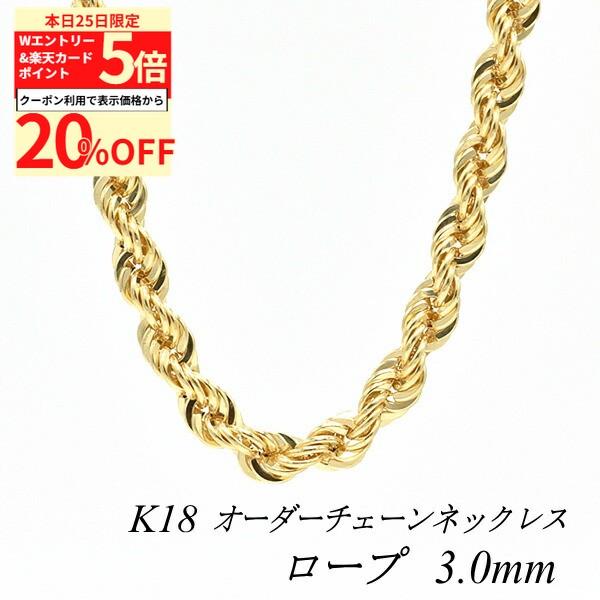 【20%OFFクーポン+Wエントリー&楽天カードでP5倍23:59まで】18金 ネックレス ロープチェーン 3.0mm 長さ選べるオーダーチェーン 40cm〜120cm 45cm 50cm 55cm 60cm 18金 K18 18K イエローゴールド 180日間お修理保証 347,820 ~