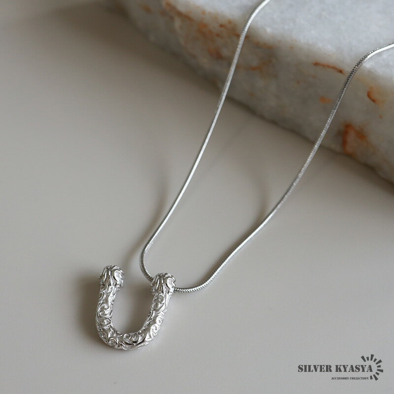 詳細 商品概要 ■ITEM DETAIL 馬蹄モチーフに繊細に刻まれた唐草模様がおしゃれなネックレス。 細身のスネークチェーンが華奢な女性を演出してくれます。 ■SILVER925素材 シルバー925は、銀含有率(純度)92.5%を示し、一般的に純銀として扱われています。 サビや劣化等がほとんどなく金属アレルギーも出にくいとされており、アクセサリーとして重宝される金属です。 ■ステンレス素材を使用 チェーン部分は頑丈なことで知られるステンレス素材を採用。 耐久性はもちろん耐水性も高く水場での着用も可能。 金属アレルギーも出にくいとされている金属です。 素材 トップ:シルバー925、チェーン:ステンレス スペック ペンダント:約14.5mm×約13mm×約4.5mm チェーン:幅約1mm 長さ:約45cm/約50cm/約60cm 総重量:約4g程度 その他 ・SILVER KYASYA[シルバーキャシャ]当店オリジナル巾着ポーチ付属 ・関連アイテム 【キーワード】 女性 女子 レディース ガール シンプル プレーン アクセサリー シルバーアクセサリー ジュエリー デイリー 日常使い 普段使い つけっぱなし 大人 大人女子 可愛い かわいい お洒落 おしゃれ 華奢 きれいめ カジュアル フォーマル コンサバ フェミニン ノームコア ボーイッシュ マニッシュ セクシー ガーリー モード ストリート 渋谷 原宿 韓国系 マルチアイテム コーデ ファッション スタイル おすすめ 人気 流行 ご褒美 お揃い ペア 記念日 誕生日 お祝い 結婚式 マリッジ クリスマス バレンタイン プレゼント ギフト メール便 ヤマト運輸 ラッピング対応 代引き対応 ギフト包装 送料無料 最短 即日発送 \10%OFFクーポン/シルバー925 馬蹄ネックレス 唐草模様 シルバー スネークチェーンネックレス 45cm/50cm/60cm ステンレス アラベスク ホースシュー レディース 女性 お洒落 人気 トレンド 流行り 金属アレルギー対応 8,140 ~