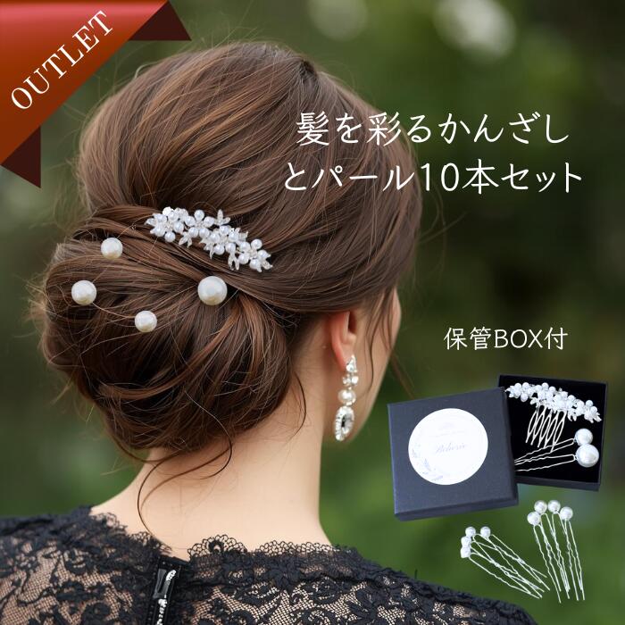 商品情報素材イミテーションパールサイズ■パールかんざし縦 5.5cm横 8cmコーム幅 2.5cm■パールピンサイズ違いパール 10本セット内容パール花かんざし 1個パールピン 10本専用箱付きその他整髪料などが付着したまま長時間保管するとパールの艶が損なわれたり、金属の変色の原因となります。 ご使用後は乾いた柔らかい布で拭き取り付属の箱に入れて保管することをおすすめします。 アウトレット品のご注意通常の品質基準を僅かに満たさなかった商品を特別価格にてご提供しています。 すべて新品・未新品。 正規品と変わりなく使用上は問題ございませんのでご安心ください。 商品の状態は、それぞれ異なります。 ランダムに出荷いたしますので、商品の状態は選べません。 返品・交換・保証の対象外となりますご理解いただいた上でご注文ください。 \ 訳あり品 /アウトレット 留袖 髪飾り 母親 結婚式 かんざし パール 10点セット 箱付き 簪 和装髪飾り 50代 60代 卒業式 入学式 訪問着 花 着物 ヘアアクセサリー 送料無料 簪 かんざし 和装 洋装 60代 50代 40代 パールピン セット ヘアピン おしゃれ 結婚式 呉服 着物 訪問着上品 真珠 収納箱付き プレゼント ギフト 箱付き 【商品説明】結婚式などのドレスや和装の装いを上品に引き立てるパールの髪飾り。 お花モチーフのかんざしとパールのヘアピン10本をセットにしました。 収納に便利な当店オリジナルの専用箱に入れてお届けします。 美容室や式場へ持参する際にご使用ください。 浴衣や訪問着、黒留袖、七五三、2次会、お呼ばれなど和装・洋装どちらも使える髪飾りセット。 自由に組合せができるので、装いやヘアスタイルに合わせてアレンジができるのも嬉しいポイント。 ハーフアップからアップスタイルなどヘアスタイルを一層引き立てます。 かんざしのコーム先端は抜け落ちにくいシャープ形状の金属製で髪にしっかり固定されます。 くし型コームタイプは髪に通して飾るだけの手軽さも魅力です。 ■このような方におすすめ和装に合うおしゃれなアクセサリーを探している。 スタイルに合わせてアレンジを楽しみたい。 特別な日を彩る上品な髪飾りを見つけたい。 大切な方への贈り物として、特別感のあるものを考えている。 【商品詳細】■セット内容パールかんざしパールピン 10本■サイズ 花かんざし 縦5.5cm 横8cmサイズ違いパールピン 10本■素材イミテーションパール■カラーホワイトパールシルバー金具【使用シーン・用途例】和装黒留袖、色留袖、訪問着、七五三、初詣、浴衣、成人式。 洋装ウェディング、ブライダル、結婚式お呼ばれ、発表会、食事会、旅行、卒業式、入学式、成人式フォーマル、セレモニー。 5 \ 訳あり品 /アウトレット 留袖 髪飾り 母親 結婚式 かんざし パール 10点セット 箱付き 簪 和装髪飾り 50代 60代 卒業式 入学式 訪問着 花 着物 ヘアアクセサリー 1,600 ~