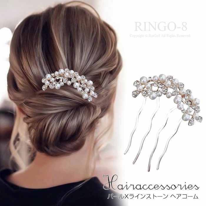 髪飾り 4点セット ヘアピン コーム かんざし パール 白 花 結婚式 成人式 卒業式 和装 洋風 着物 留袖 振袖 訪問着 色打掛 袴 浴衣 ゴールド ヘアアクセサリー お呼ばれ 前撮り 日本髪 30代 40代 50代 アレンジ自在のヘアコーム&ピン 4点セット 花&リーフモチーフのビジューとパール ・ラインストーンを丁寧にはめ込んだヘアコーム・ヘアピンのセットです。 金色&白色のボタニカルモチーフのビジューは華やかでありつつ、上品なデザイン・色合いが特徴。 和服と洋服どちらにも合わせやすく、品のいい女性らしさを際立たせててくれます。 ワイヤーは簡単に形付けができ、1点使いから4点すべてを使ったスタイルまでアレンジは自由自在。 結婚式や成人式、卒業式などのフォーマルなイベントはもちろん、普段使いにも華やかな印象を与えてくれる一品です。 ◆内容 コーム(大)×1・コーム(小)×1・ピン×2◆サイズ コーム(大):モチーフ部分 約145mm x 55mm コーム含み全高 約70mm コーム(小):モチーフ部分 約75mm x 45mm コーム含み全高 約70mm ピン:モチーフ部分 約25mm x 20mm ピン部分含み全高 約75mm 5 和装 2本セット 浴衣 ヘアアクセサリー マジェステ 簪 ヘアアレンジ かんざし 簪 ヘアピン ひらうち 送料無料 おしゃれ ヘアアクセサリー 着物 ひらうち 和装小物 ヘッドドレス 結婚式 成人式 七五三 シンプル 3,503 ~