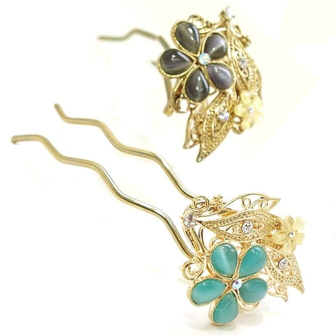 【残りわずか】uスティック かんざし 折り曲げ キャッツアイ風ストーン リリー 〔コーム Uピン 華やか 髪飾り キラキラ ラインストーン 夜会巻き シニヨン 着物 和装 留袖 ヘアアレンジ まとめ髪 おしゃれ ワンポイント〕 1,485 ~