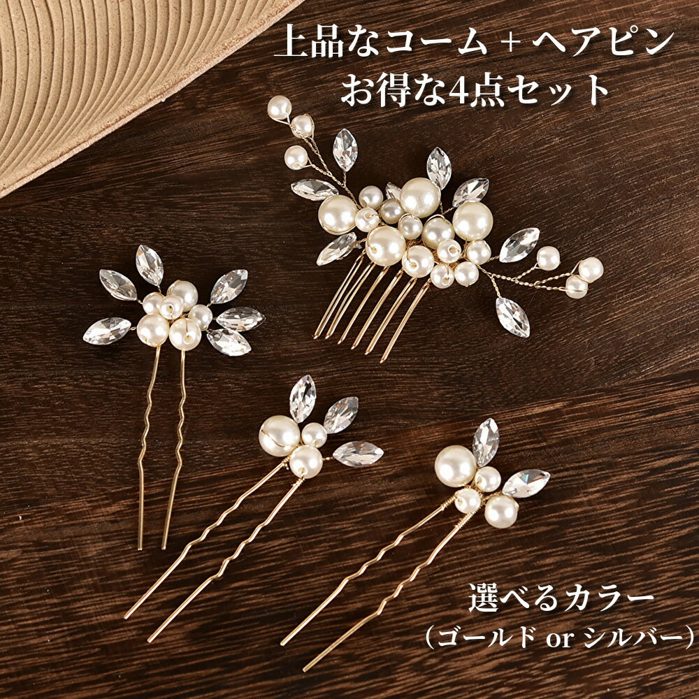 髪飾り 4点セット ヘアピン コーム かんざし パール ゴールド シルバー 結婚式 成人式 卒業式 和装 洋風 着物 留袖 振袖 訪問着 色打掛 袴 浴衣 ヘアアクセサリー お呼ばれ 日本髪 アレンジ自在のコーム&ヘアピン 4点セット パール&クリアビーズを丁寧にはめ込んだヘアコーム・ヘアピンのセットです。 上品かつ華やかなデザイン・色使いが特徴。 和服と洋服どちらにも合わせやすく、品のいい女性らしさを際立たせててくれます。 モチーフ部分はワイヤーで簡単に形付けができ、1点使いから4点すべてを使ったスタイルまでアレンジは自由自在。 結婚式や成人式、卒業式などのフォーマルなイベントはもちろん、普段使いにも華やかな印象を与えてくれる一品です。 ◆内容 コーム×1・ヘアピン×3◆カラー ゴールド / シルバー◆サイズ コーム:モチーフ部分 約45mm x 88mm コーム含み全高 約60mm ヘアピン:モチーフ部分 約24mm x 22?44mm ピン部分含み全高 約70?78mm◆素材 合金・人工パール・ビーズ・アクリル樹脂 他 5 髪飾り 4点セット ヘアピン コーム かんざし パール ゴールド シルバー 結婚式 成人式 卒業式 和装 洋風 着物 留袖 振袖 訪問着 色打掛 袴 浴衣 ヘアアクセサリー お呼ばれ 日本髪 1,380 ~