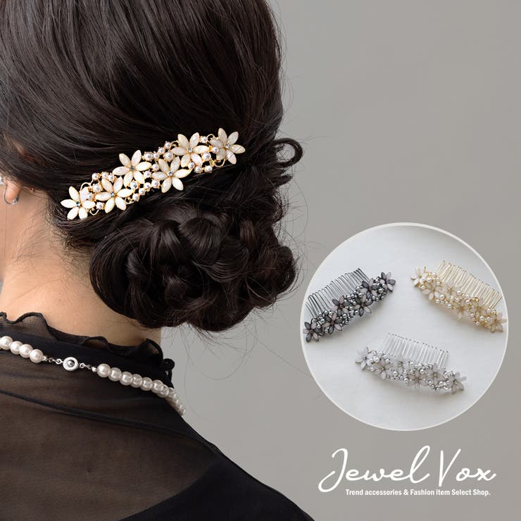 ※ビジュー表面には若干の傷や凹凸や気泡・黒い点が見られる場合がございます。 ※表面には細かい傷や凹凸、色ムラが見られる場合がございます。 ※こちらの商品はメッキ加工を施しております。 そのため汗・水に大変弱く、水分が付着する可能性がある場合には必ずお外しください。 ■商品詳細■▽サイズ:モチーフ全体:約W11.0×H3.0cmコーム長さ:約3.2cm▽重量:約33.5g▽カラー:アイボリー / ホワイト / グレー美しいフラワーモチーフと小粒のパールを合わせたエレガントなヘアコームです。 ゆるやかなカーブがヘッドラインに合わせやすく、アップスタイルを華やかに演出してくれます。 どこかクラシカルな雰囲気もあり、洋装にも和装にも合わせやすいデザインです。 【商品のお気に入り登録】人気商品の再入荷や値下げの通知をいち早く受け取ることが出来ます♪返品・交換について購入後の交換は受け付けておりません。 予めご了承ください。 返品を希望される場合は購入履歴一覧の「ショップへの問い合わせ」よりお問い合わせください。 =========================複数配送先指定について1件の注文に対して、異なる住所への配送は対応出来かねます。 恐れ入りますが、異なる住所へ配送をご希望の場合、配送先毎に分けて注文いただきますようお願い申し上げます。 【ヘアアクセサリーWOMEN】アイボリー ホワイト グレー 選択アイボリー ホワイト グレー Jewel vox ヘアアクセサリー ヘアコーム レディース アレンジ まとめ髪 コーム フラワー 花 ヘアーアクセサリー ホワイト アイボリー グレー パール 30代 40代 50代 韓国 大人 韓国 1,960 ~