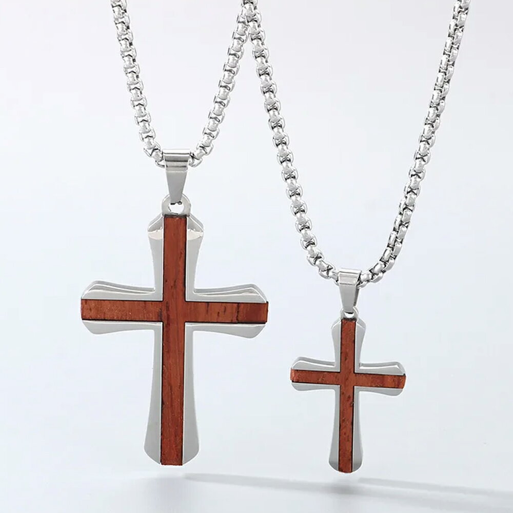 ウッドクロスネックレスは、サージカルステンレス316L製の十字架の台座に天然の木材をはめ込み、サージカルステンレス316Lを使用した60cmのチェーンが付属した、耐久性とスタイリッシュさを兼ね備えています。 木目の美しい十字架のペンダントトップが特徴で、メンズ・レディースどちらにも適したデザインです。 甲丸リングチェーンが首元を引き立て、日常使いから特別な日まで幅広く活躍します。 クリスマスプレゼントとしても最適で、シンプルながらも存在感のあるアクセサリーです。 クロスの大きさが選べるので、メンズ用、レディース用としてペアルックにもオススメ!人気のプレゼントに最適のジュエリーです。 [スペック][Lサイズ]ネックレスの長さ:約60cm太さ:3mmトップの大きさ:約34mmx52mmx3.0mm[Sサイズ]ネックレスの長さ:約60cm太さ:3mmトップの大きさ:約22mmx33mmx3.0mm[素材]サージカルステンレス316L/ウッド[備考]・表示は1ヶの価格です。 写真はイメージです。 実際の商品とは多少異なる場合がございます。 手作業による採寸のため、多少の誤差が生じる場合がございます。 ご了承ください。