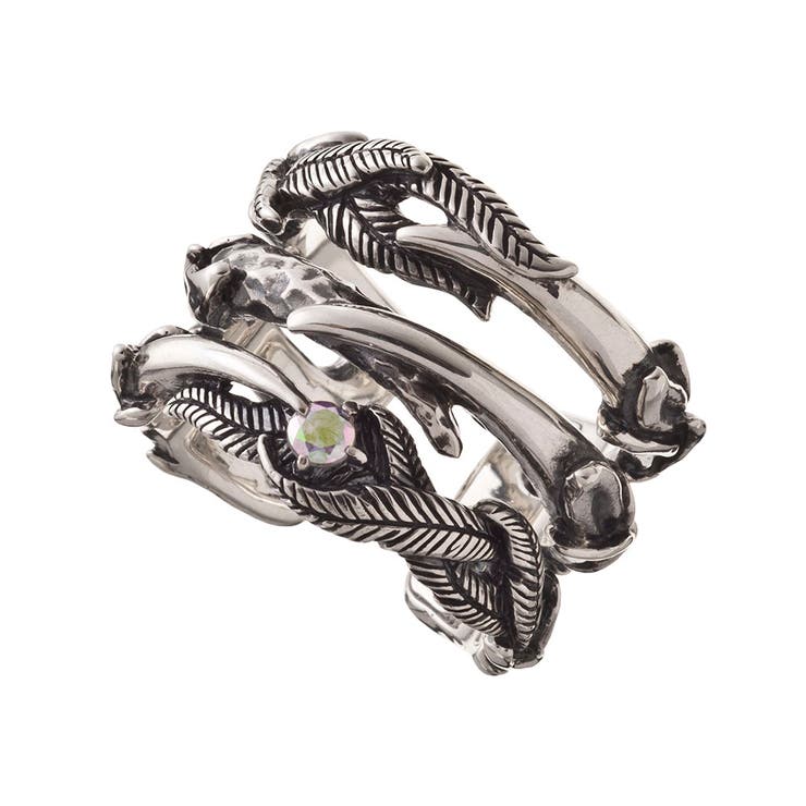 指をすっと細く見せる、空間を生かした3連シルエットのカフリング。 重ね着けしたように見える構成に、翼・羽根・クローを繊細に彫り込み、大天使ウリエルを想起させる佇まいに仕上げました。 鏡面と槌目、燻しのコントラストが奥行きを生み、流れるようなラインが指先の動きに呼応して表情を変えます。 要所には虹色にきらめくミスティッククォーツをひと粒。 強さと気品を両立させる小さな光が、ワイドフォルムをシャープに引き締めます。 内側のエッジまで滑らかに磨き上げ、快適な着け心地にも配慮。 単体で主役としてはもちろん、モノトーンのアクセサリーとのレイヤードにも好相性です。 ブランドの意匠と提携工房の高度なクラフトで完成させた、こだわりの作品です。 ■素材:シルバー925/ミスティッククォーツ■幅:17mm■厚:4mm■重:15.3g■発送時リングサイズ:15号※フリーサイズの商品ですが、金属疲労を少しでも軽減するためにサイズ設定を設けております。 号数によって多少見え方が異なる場合がございますので予めご了承ください。 ※お使いいただいている液晶モニターにより実際の商品と色味が異なって見える場合がございます。 予めご了承ください。 返品・交換について購入後の交換は受け付けておりません。 予めご了承ください。 返品を希望される場合は購入履歴一覧の「ショップへの問い合わせ」よりお問い合わせください。 =========================複数配送先指定について1件の注文に対して、異なる住所への配送は対応出来かねます。 恐れ入りますが、異なる住所へ配送をご希望の場合、配送先毎に分けて注文いただきますようお願い申し上げます。 【アクセサリーMEN】15号