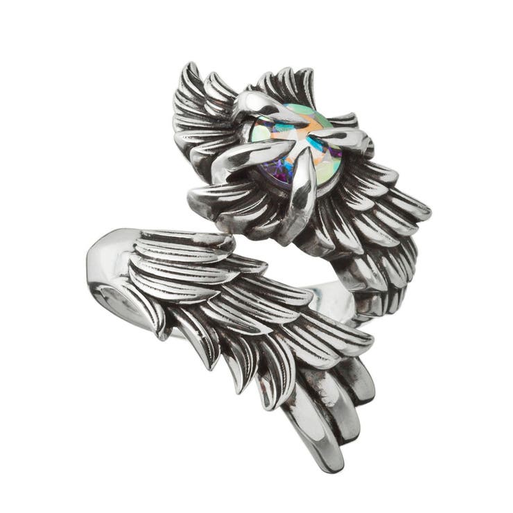 四大天使ウリエルを想わせる、気流を纏ったようなウイングリング。 渦を描く翼が指を包み込み、頂に据えたミスティッククォーツを鋭いクローが抱く??角度ごとにグリーンからバイオレットへと表情を変える虹彩が、白銀の艶と呼応して幻想的に煌めきます。 羽根一枚一枚まで丁寧に彫り込み、燻しの陰影で立体感を強調。 オープン気味のバイパスシルエットは指馴染みがよく、適度なボリュームながら着け心地は軽やかです。 翼は“飛躍・上昇”を象徴するモチーフ。 守護の想いを指先に宿し、日常から特別なシーンまで、視線をさらう存在感を放ちます。 ギフトにも最適。 ■素材:シルバー925/ミスティッククオーツ■幅:22mm、厚:6mm、重:12g■発送時リングサイズ:15号※フリーサイズの商品ですが、金属疲労を少しでも軽減するためにサイズ設定を設けております。 号数によって多少見え方が異なる場合がございますので予めご了承ください。 ※お使いいただいている液晶モニターにより実際の商品と色味が異なって見える場合がございます。 予めご了承ください。 返品・交換について購入後の交換は受け付けておりません。 予めご了承ください。 返品を希望される場合は購入履歴一覧の「ショップへの問い合わせ」よりお問い合わせください。 =========================複数配送先指定について1件の注文に対して、異なる住所への配送は対応出来かねます。 恐れ入りますが、異なる住所へ配送をご希望の場合、配送先毎に分けて注文いただきますようお願い申し上げます。 【アクセサリーMEN】15号