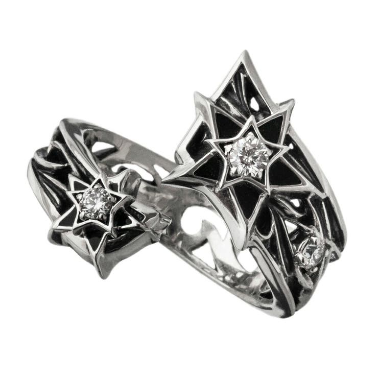 ■素材:シルバー925/エナメル/CZクリア■サイズ:幅 21mm、厚 6.5mm、重さ 10g■FREE(11号〜21号)夜空の輝きを指先へ??二つのスターが立体的に重なり合うモードなリング。 センターには澄んだきらめきのCZ、周囲には深い黒の練りブラックサファイアを配し、モノトーンのコントラストで洗練を際立たせます。 シャープな星の稜線と、サイドに走る透かし模様が光を取り込み、角度ごとに表情を一新。 ワイドながら抜け感のある設計で、装いの重心をすっと引き締めます。 仕立てはアトリエで一つひとつ丁寧に成形・彫刻・磨きを重ね、指なじみの良い滑らかさと精巧なディテールを両立。 フリーサイズ仕様でフィット感の微調整も容易です。 単品で強く、同モチーフのペンダントと合わせればさらにスタイルに一貫性を。 日常から特別なシーンまで頼れる、現代の装いに寄り添うアートピース。 タイムレスに愛せる一本です。 ◆ご注文前に必ずご確認下さい◆※フリーサイズの商品ですが、金属疲労を少しでも軽減するためにサイズ設定を設けております。 号数によって多少見え方が異なる場合がございますので予めご了承ください。 ※ご覧頂くモニター環境により、色合いに若干の誤差が出ます。 ※表記サイズはスタッフによる実寸となります為、測り方により誤差が出る場合がございますので、予めご了承下さいませ。 ※アイテムによって付属しないものや、付属品の仕様が予告なく変更される場合がございます。 ※アクセサリーはとてもデリケートな商品です。 強く引っ張ったり擦ったり等、強い衝撃を受けますと破損する場合がございますので、 お取り扱いには十分ご注意下さいませ。 返品・交換について購入後の交換は受け付けておりません。 予めご了承ください。 返品を希望される場合は購入履歴一覧の「ショップへの問い合わせ」よりお問い合わせください。 =========================複数配送先指定について1件の注文に対して、異なる住所への配送は対応出来かねます。 恐れ入りますが、異なる住所へ配送をご希望の場合、配送先毎に分けて注文いただきますようお願い申し上げます。 【アクセサリーMEN】15号 【10%OFFクーポン!2/10(火)1:59まで】ArtemisClassic アルテミスクラシック/ダブルスターリング シルバーリング/15号 アクセサリー 19,800 ~