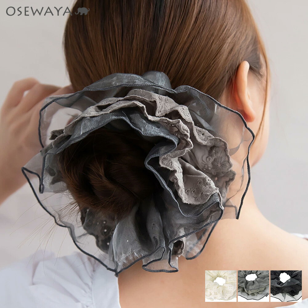シュシュ ビッグ シアー フリル コットンレース フラワー模様 リボン模様 刺繍 | OSEWAYA ヘアアクセサリー ヘアアクセ レディース 女性 大人 プレゼント ギフト 結婚式 カジュアル おしゃれ オシャレ かわいい 可愛い 1,650 ~