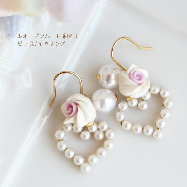 【サイズ】全長:約2.5cm(金具含まず) ハート:縦1.8,横2cm 【素材】金具:メッキ花:クレイ 【デザイナーからのコメント】 ぷくぷく白いパールでできたオープンハートは久しぶりにキュン♪となったチャームです! 大きさも見た目もパーフェクト♪♪♪ もっと可愛いと思えるように、クレイの白×紫色の巻き薔薇を一輪添えてコーディネイト。 上品で可愛いスタイルが完成♪ ◆有料タイプのキャッチ式チタン・樹脂ピアスへ金具変更ご希望の方は【コチラ】 より必要個数をショッピングカートに商品と一緒にお選び頂きご注文くださいませ。 このピアスのキャッチはオプション(有料)でパールキャッチへ変更可能です♪詳しくは↑ この商品は無料の樹脂イヤリングの他にネジばね式イヤリング(有料)への変更も可能です♪詳しくは↑ + + + S e t I t e m + + +