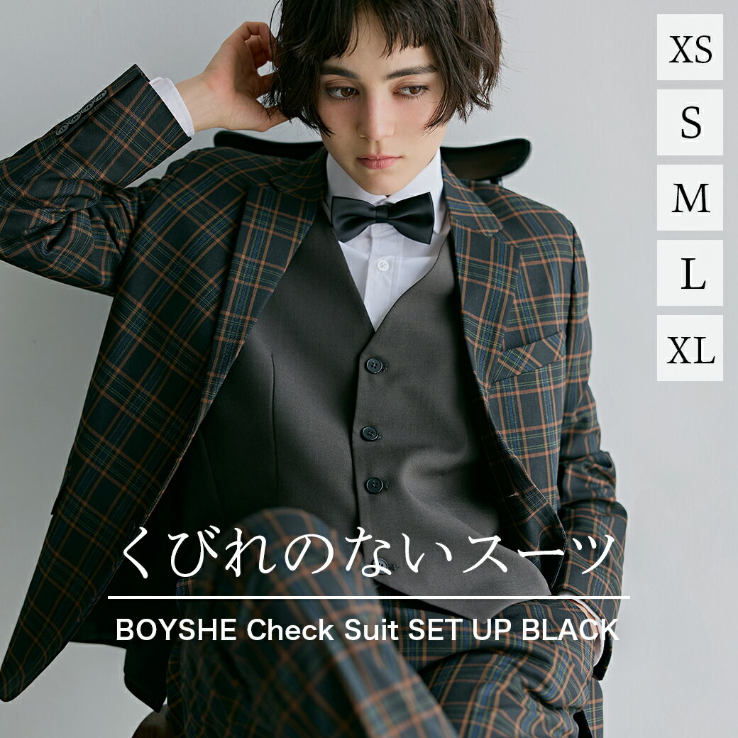 【商品詳細】 ●素材:ポリエステル 65%、レーヨン 32%、ポリウレタン 3% ●注意書き ※商品のディテールデザインがイメージと違う場合がございます。 ※モニター発色の具合により、実物とは色合いが異なる場合がございます。 「くびれのないボーイッシュスーツ」 チェック柄 ブラックが登場! "スーツにくびれは必要?" その思いから誕生したBOYSHE Originalスーツ。 体型を拾わないストレートなシルエットで、 メンズライクなルックスが特徴。 トレンドに左右されないベーシックなデザイン。 ジャケットの絶妙な着丈のバランスがスマート。 ナチュラルショルダーでストレッチ性が高く、快適な着心地。 スラックスはスリムテーパードシルエットで、 すっきりとしたキレイなレッグラインがポイント。 ベルト不要で着用できる両サイドのゴム仕様により、 高いストレッチ性と快適な着心地を実現。 ビジネスシーンはもちろん、 成人式や入学式、卒業式、結婚式、パーティーなど、 キレイめカジュアルスタイルにも対応し、 どんなシーンでも活躍。 セットアップでも単品でも着回しやすいユーティリティ性が魅力。 素材はポリエステルとレーヨンをブレンドした生地を使用し、 ドライ感とハリ感がありながらも快適な着心地を提供します。 【ジャケット】 ーXSー 肩幅:38cm 身幅:44cm 着丈:60cm そで丈:54cm ーSー 肩幅:40cm 身幅:48cm 着丈:64cm そで丈:57cm ーMー 肩幅:41cm 身幅:50cm 着丈:65cm そで丈:58cm ーLー 肩幅:42cm 身幅:52cm 着丈:66cm そで丈:59cm ーXLー 肩幅:43cm 身幅:53cm 着丈:67.5cm そで丈:59.5cm 【パンツ】 ※上記の実測サイズは「断面の長さ」です。 ご参考にしてください。 ーXSー ウェスト:34-37cm ヒップ:44cm 太もも:25cm 股上:26.5cm 裾幅:17cm 総丈:89cm ーSー ウェスト:35-39cm ヒップ:46cm 太もも:28cm 股上:26.5cm 裾幅:17cm 総丈:94cm ーMー ウェスト:38-41cm ヒップ:49.5cm 太もも:28.5cm 股上:27.5cm 裾幅:17.5cm 総丈:96cm ーLー ウェスト:39-44cm ヒップ:50.5cm 太もも:29cm 股上:28cm 裾幅:18cm 総丈:97cm ーXLー ウェスト:42-47cm ヒップ:53cm 太もも:32cm 股上:28cm 裾幅:19cm 総丈:97cm 関連キーワード:ボーイッシュスーツ, ジェンダーレススーツ, ユニセックススーツ, メンズライク, パンツスーツ, レディースフォーマル, スーツセットアップ, 結婚式, 成人式, 入学式, 卒業式, 就活スーツ《BOYSHE Check Suit SIZE》 スーツ レディース チェック ブラック BOYSHE Check Suit【Black】 ボーイッシュスーツ ジェンダーレススーツ メンズライク ユニセックス スーツセットアップ フォーマルスーツ パンツスーツ ジャケット スラックス plaid チェック チェックスーツ チェック柄 年中 送料無料 42,240 ~